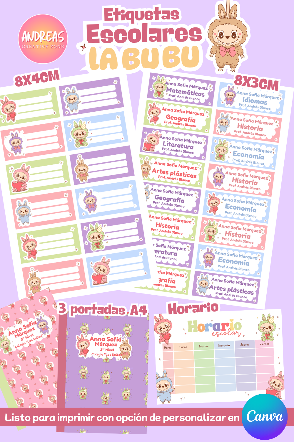 1 archivo PDF con un link de descarga que te llevara directamente a canva donde podrás editar el nombre en las etiquetas y un archivo PDF con un horario escolar de regalo.
