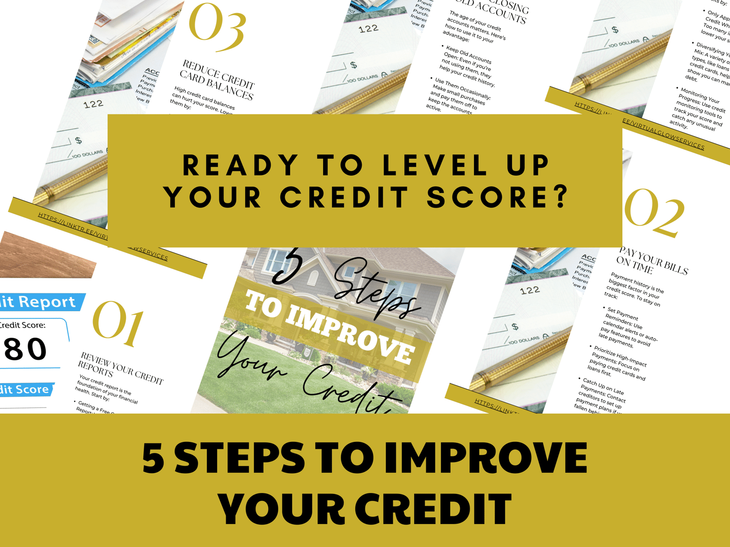 Ready to level up your credit score? Our FREE 5 STEPS TO IMPROVE YOUR CREDIT guide gives you simple, actionable steps that you can start using TODAY. Whether you’re looking to boost your credit for a big purchase, loan, or just to secure a better financial future, these proven steps will help you take control and see real results!