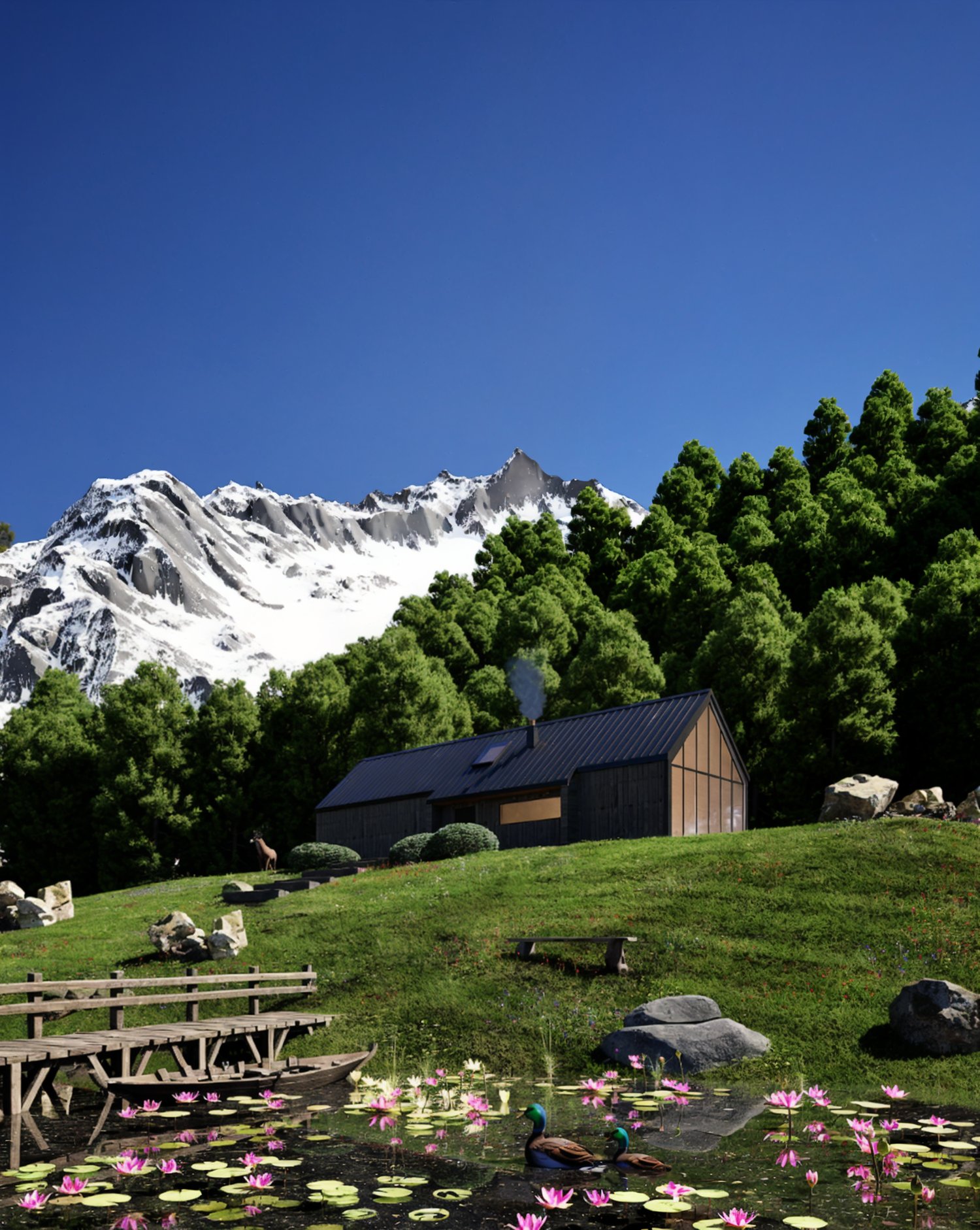 Explore this scene to learn how the landscape was created, as well as the lake in front of the cabin and all the intricate details it includes.