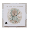 This card is perfect for a babies first birthday. Printed with a cute little bear in a Green jacket sitting amongst some reeds and pampas grass. the message reads 'on your first birthday' on the front, this cute design can be treasured for years to come.