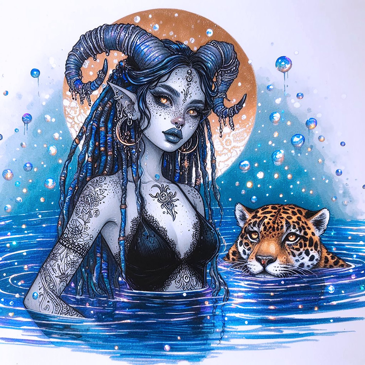 A Beautiful Female Faun in a glittering mystical blue Lake & a Jaguar. Moon & bubbles