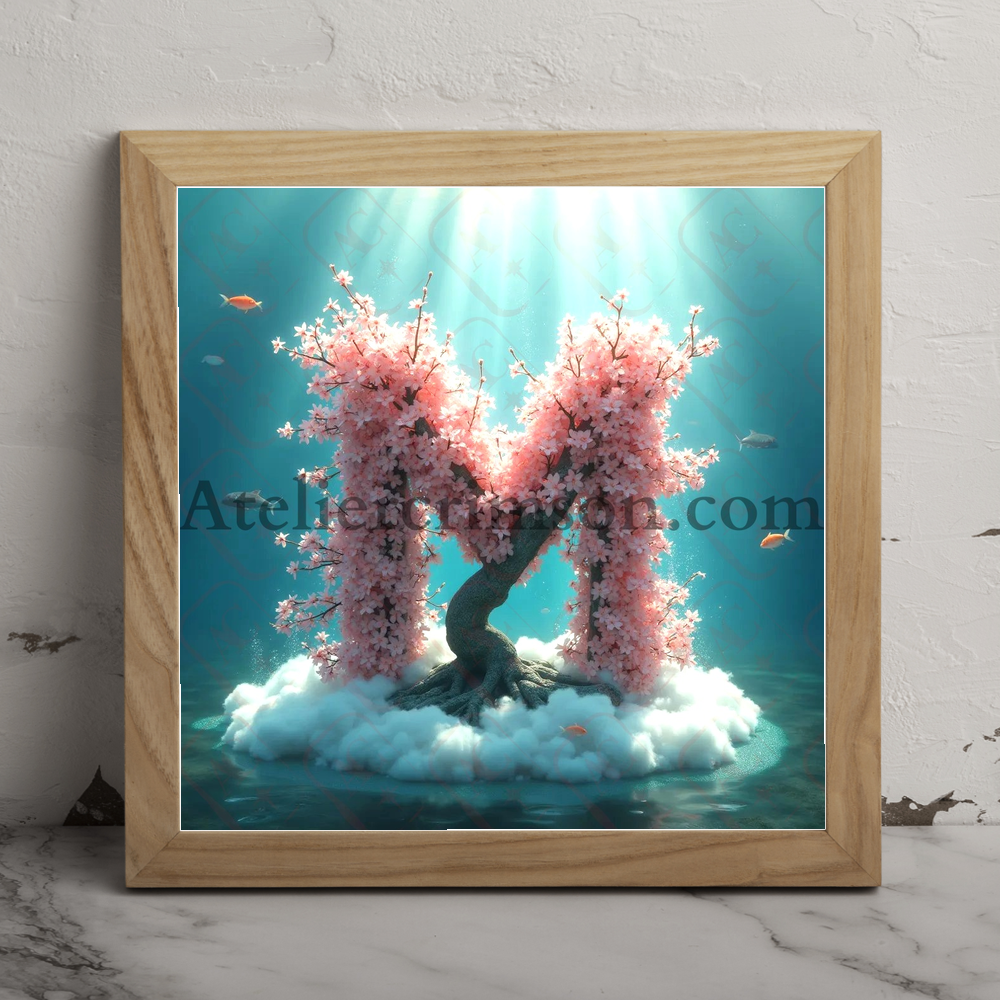The letter M bonzai aquamarin cloud a captivating digital painting with a serene underwater bonsai. Download Now this high quality AI-generated image, perfect for adding a touch of tranquility and creativity to any space.