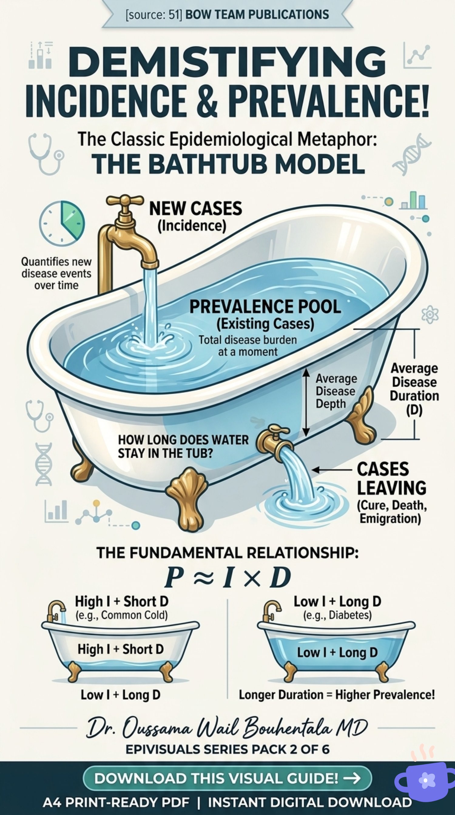 The Bathtub Model: The ultimate visual metaphor for understanding how incidence, prevalence, cure, and mortality interact.