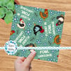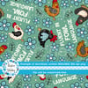 Fluent in fowl language sassy chickens on green.