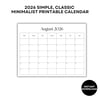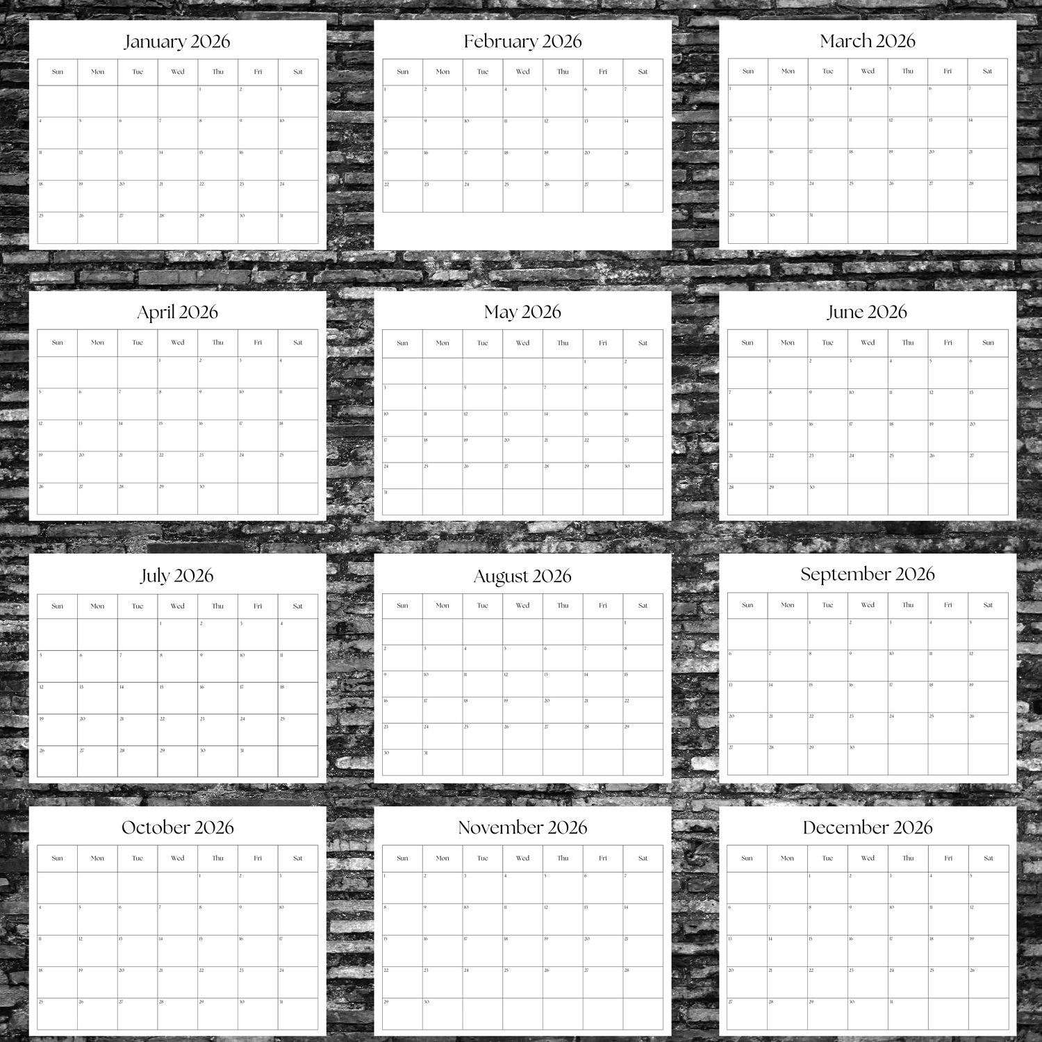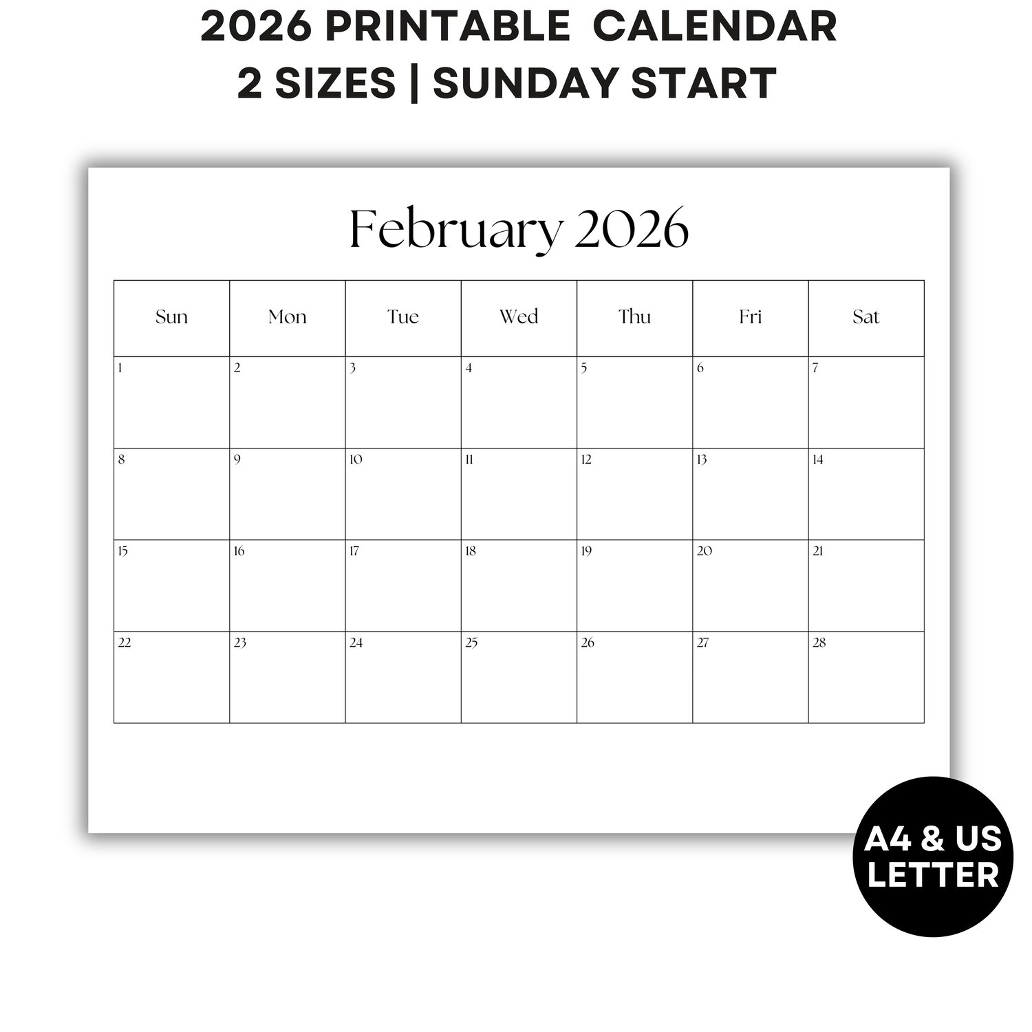 2026 Minimalist, Classic, Plain Calendar, Printable Landscape Horizontal