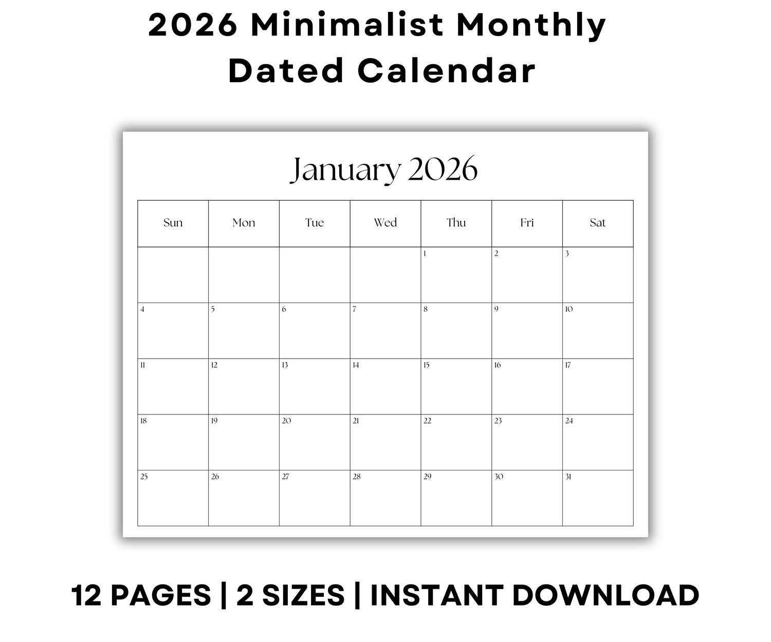 Do you want a calendar to stay organized while also having something elegant to hang on your wall or place on your desk? This printable 2026 Minimalistic Monthly Calendar is Plain and Classic, allowing you to add all your important dates and stay organized throughout the year. It comes in both US Letter and A4 and is ready to be printed at home.