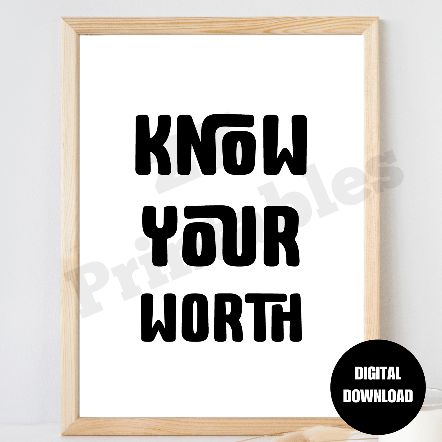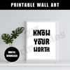 Know Your Worth Print Trendy Poster Inspirational Quote Wall Art White Black Typography College Dorm Decor Printable Digital Download JPEG