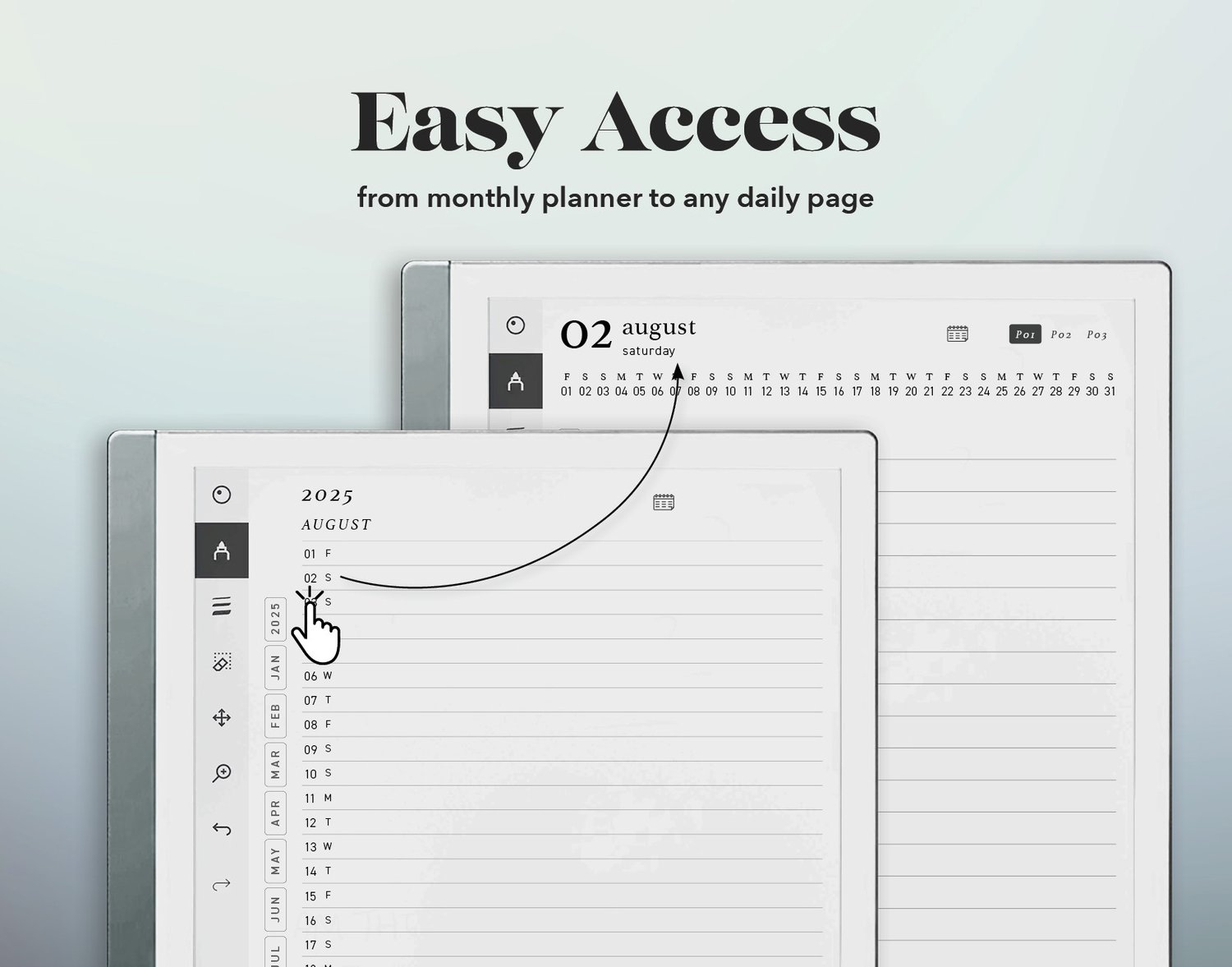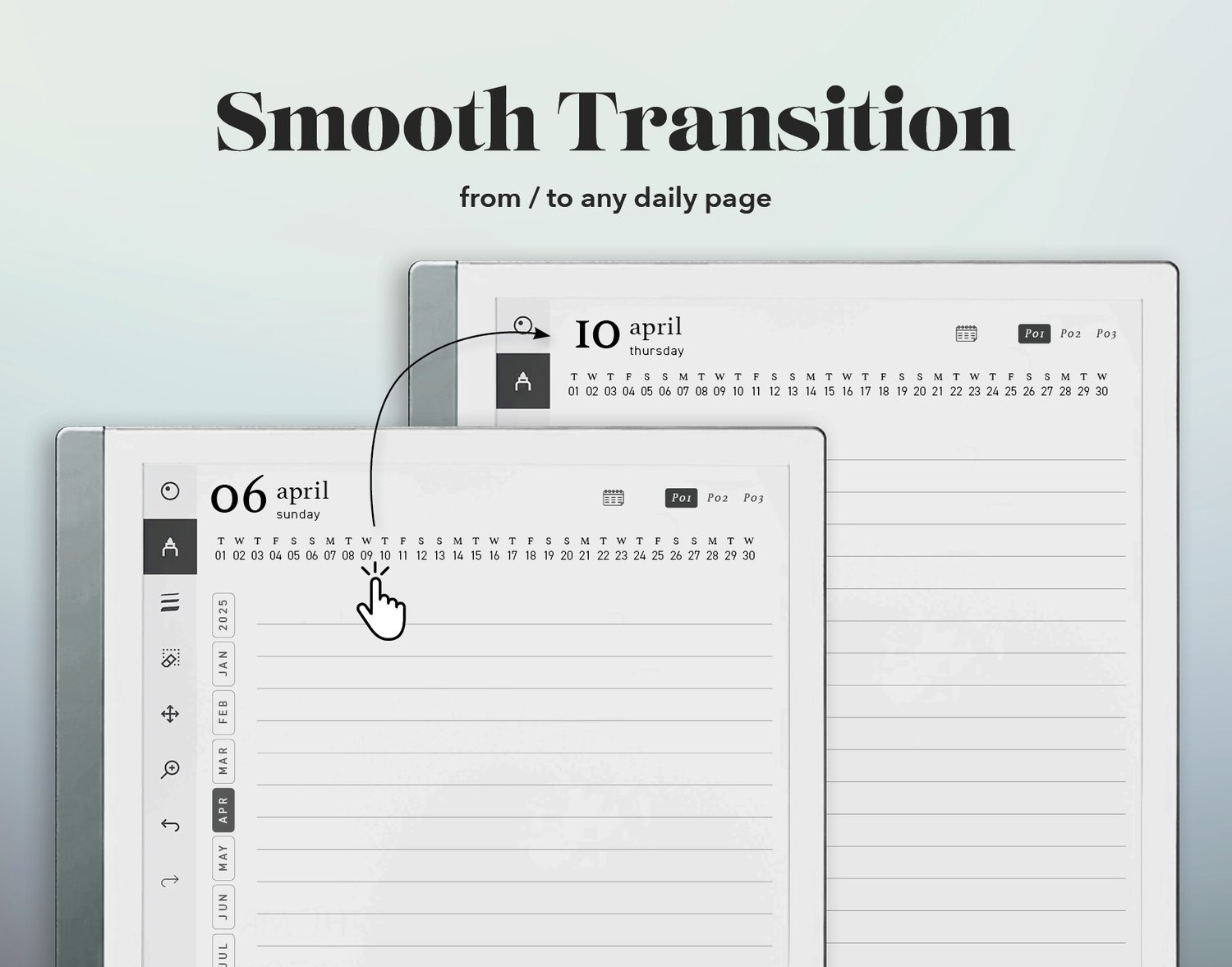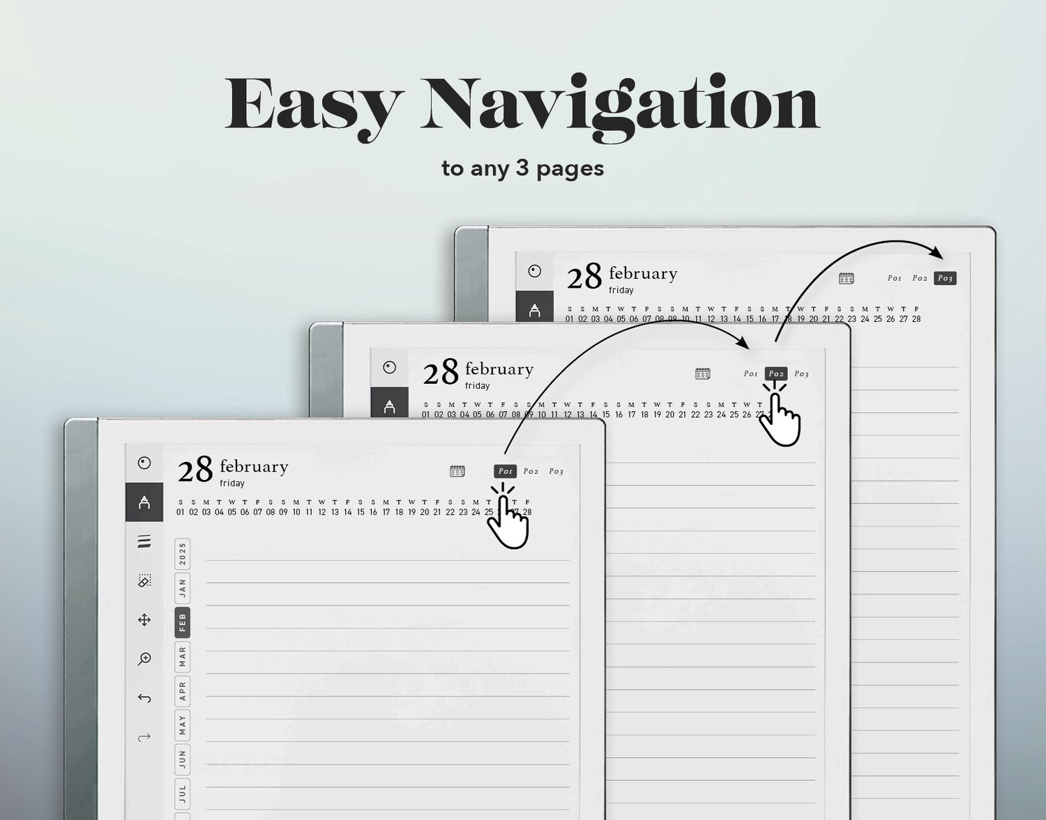 A DATED digital template designed for reMarkable 2 tablet (also compatible with reMarkable 1), hyperlinked for easy navigation.