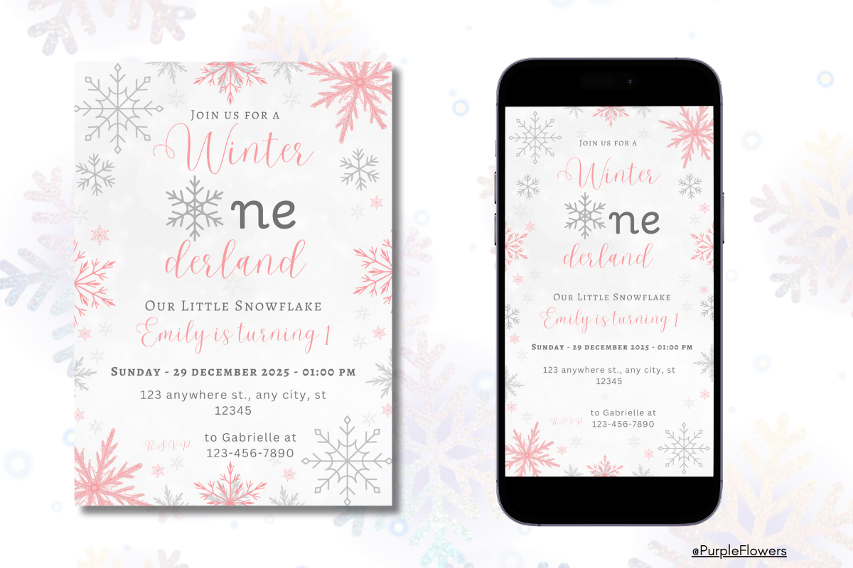 Winter ONEderland Birthday Party Invitation, Girl Snowflake First Birthday Pink Silver Invites, 1st Birthday Template Download, Christmas Girl Birthday Party Invite, Self-editable Template, Digital Invitation Template, Editable Canva Template. Mobile Invitation, e-invite Phone Invitations, printable,Text Message Invite.