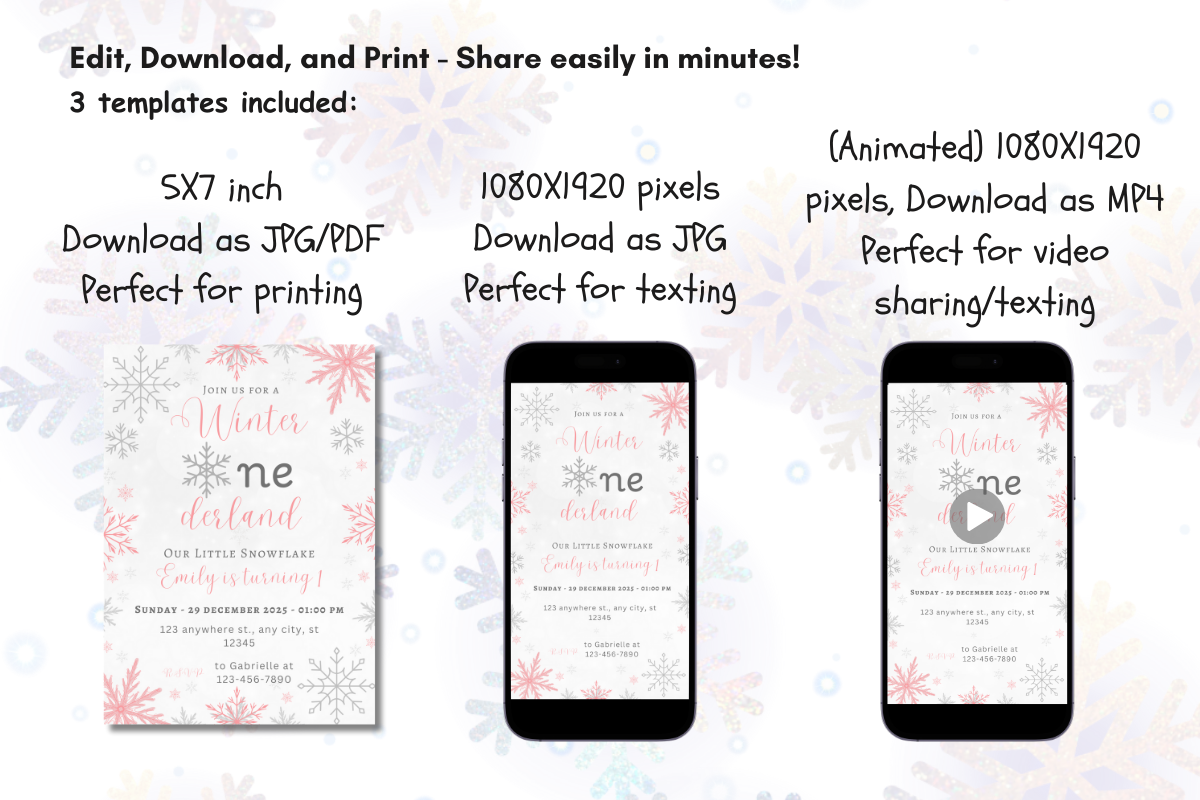 Editable Winter Onederland Invitation, Girl Snowflake First Birthday Pink Silver Invites 1st Birthday Template Download, Girl Birthday Party Invite , Self-editable Template, Kids Birthday Invitations, einvite, Mobile Invitation Evite Phone