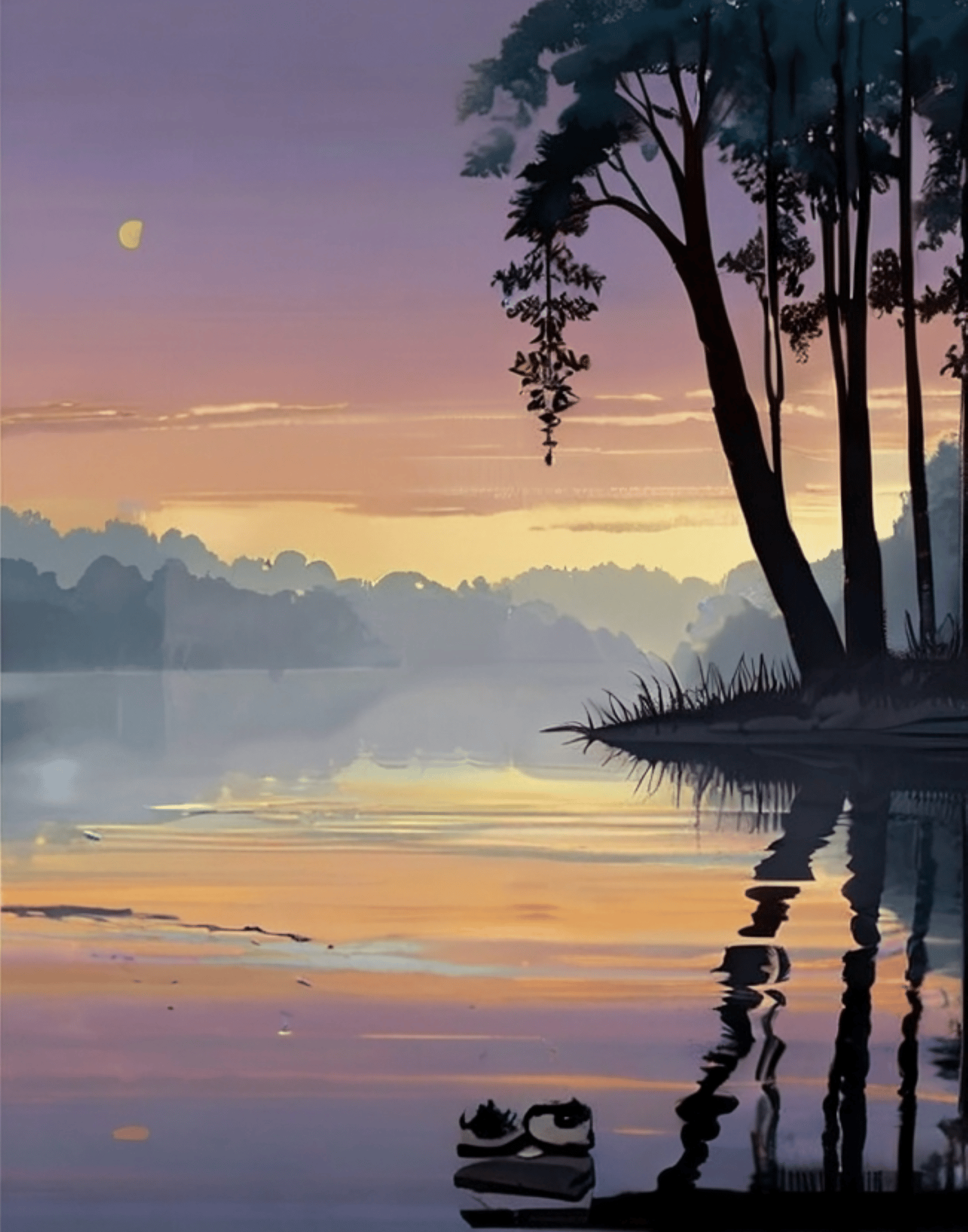 Lake landscape, Dusk, Vintage Landscape, Nostalgic Nature, Cool Nature, Rustic natural Landscape, Painting.