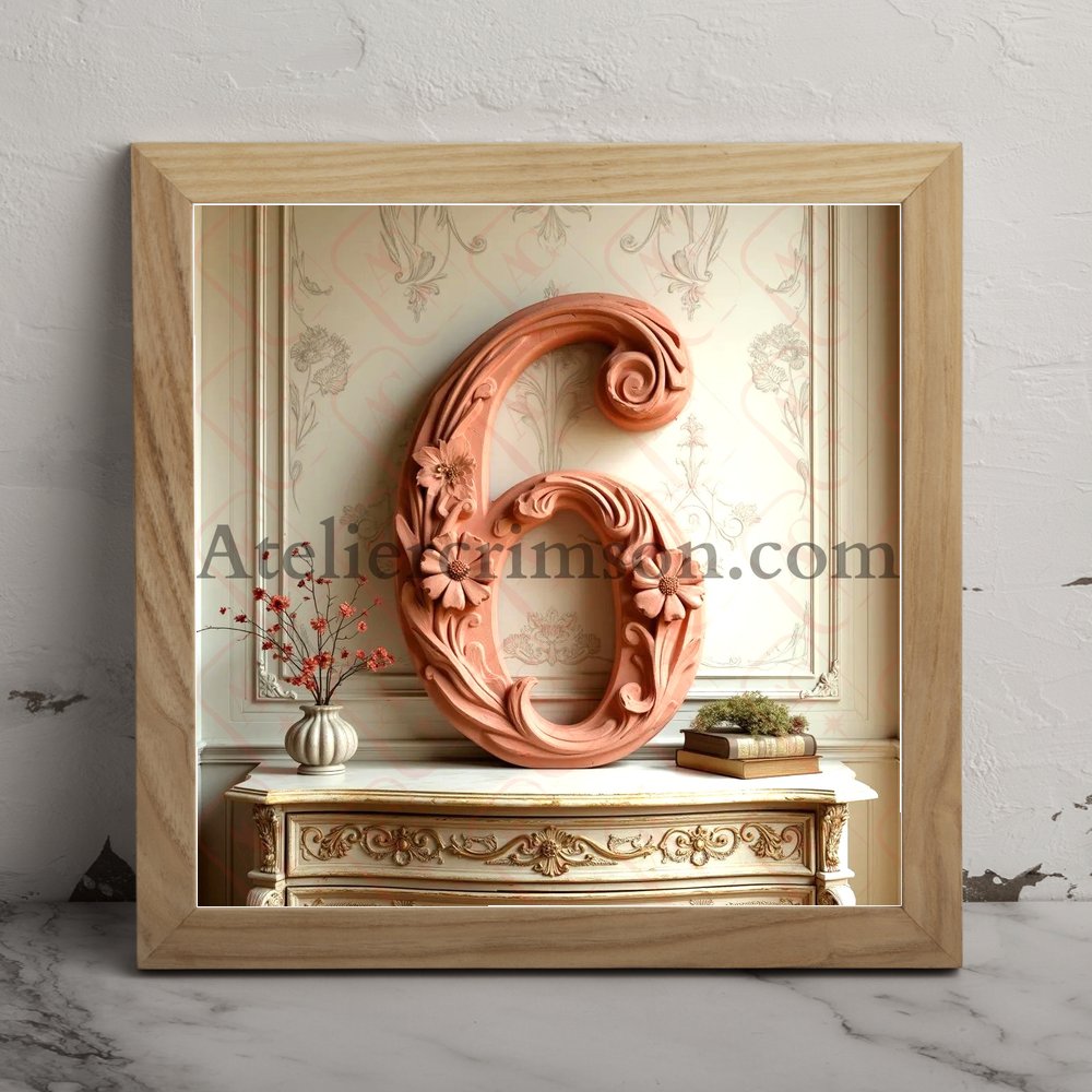 Number 6 terracotta Art Nouveau typeface inspired by Alphonse Mucha's with flowing lines and floral motifs, set against a soft, muted background with a gilded wooden dresser and subtle lighting effects.