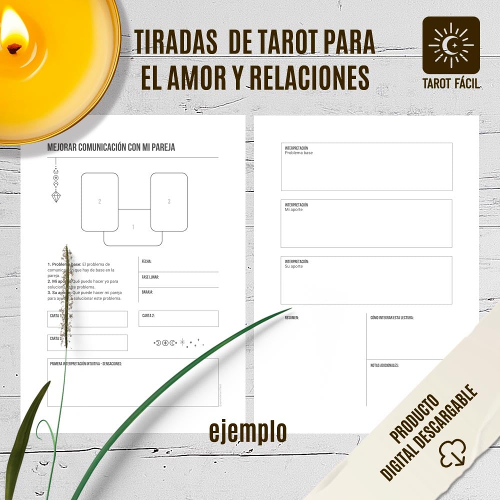 Las tiradas están presentada en un formato sencillo y claro, con recuadros para escribir tus ideas, intuiciones y mensajes del Tarot. Es un material creado para que puedas explorar tu mundo interno a tu ritmo, con calma, desde tu propia práctica.