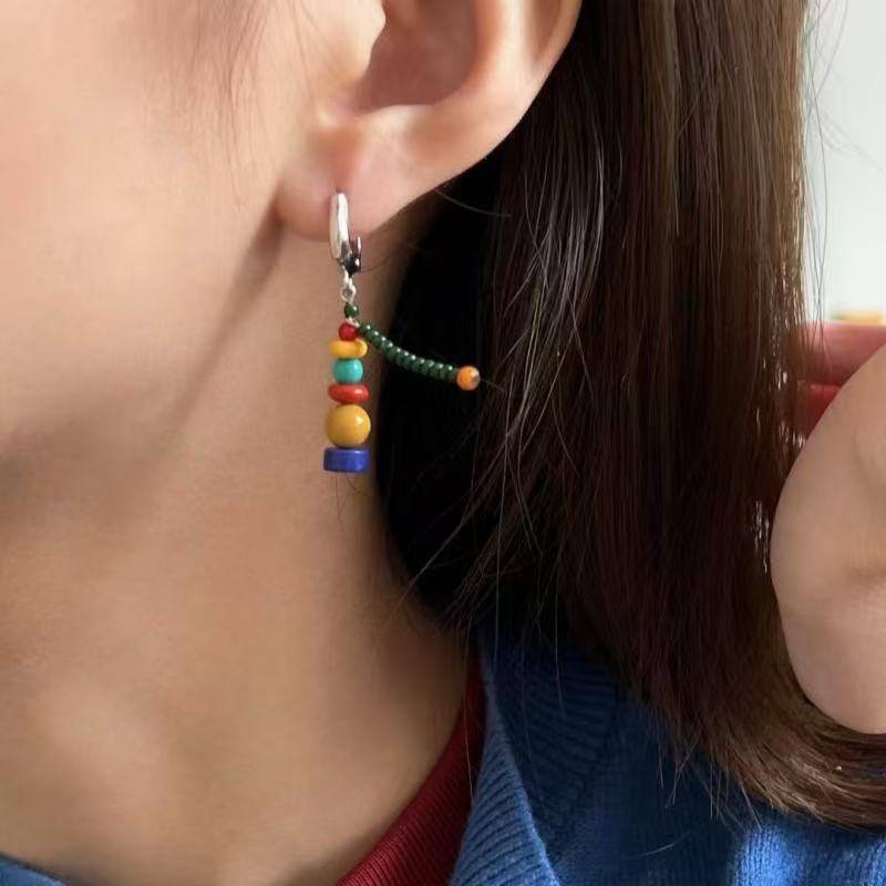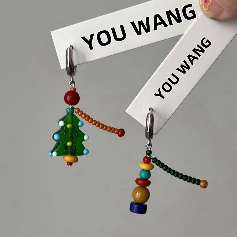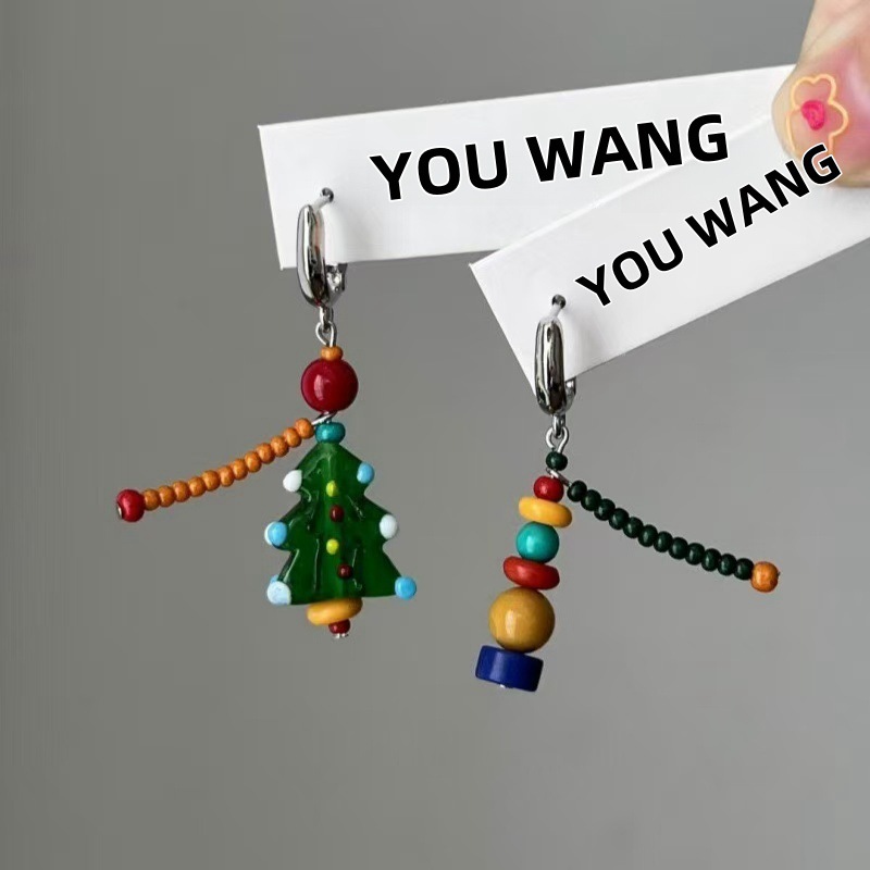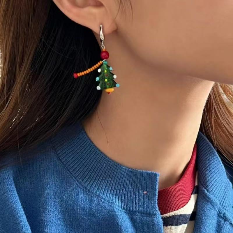 Handmade beaded playful asymmetrical colorful Christmas earrings
