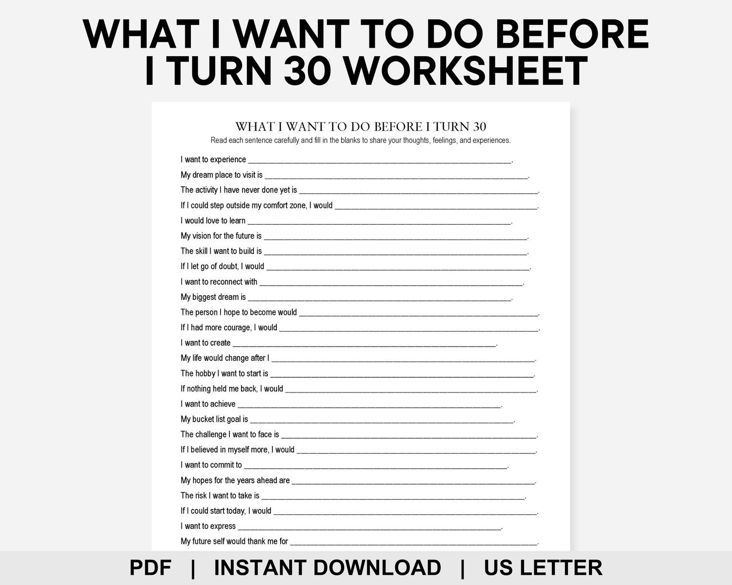 What I Want to Do Before I Turn 30 Worksheet, Bucket List, Life Goals, Vision Board, Manifestation, Goal Setting, Self Care, Birthday Games