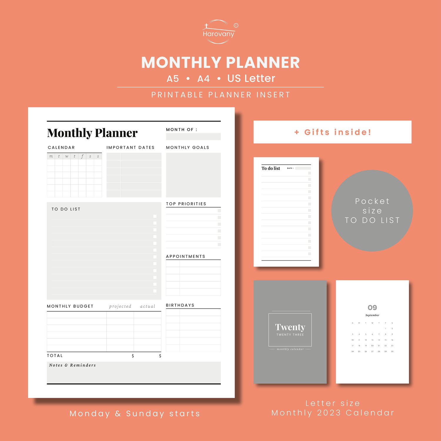 Printable Monthly Planner Insert (A4, A5, Letter size) | | Monday & Sunday Start | FREE BONUSES INSIDE | Instant download