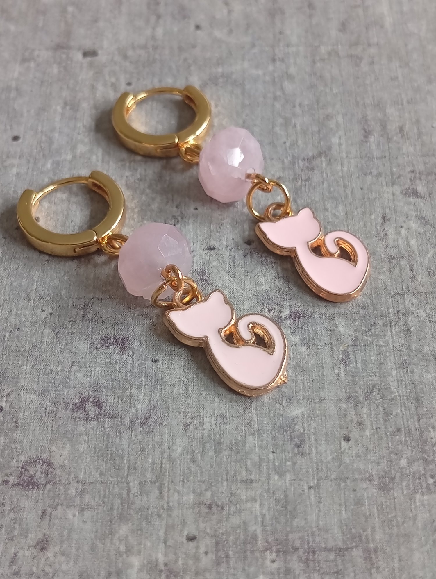 Avec leurs petits chats roses et leurs perles facettées en quartz rose, ces boucles évoquent la douceur, la complicité et la beauté des petits instants de bonheur.