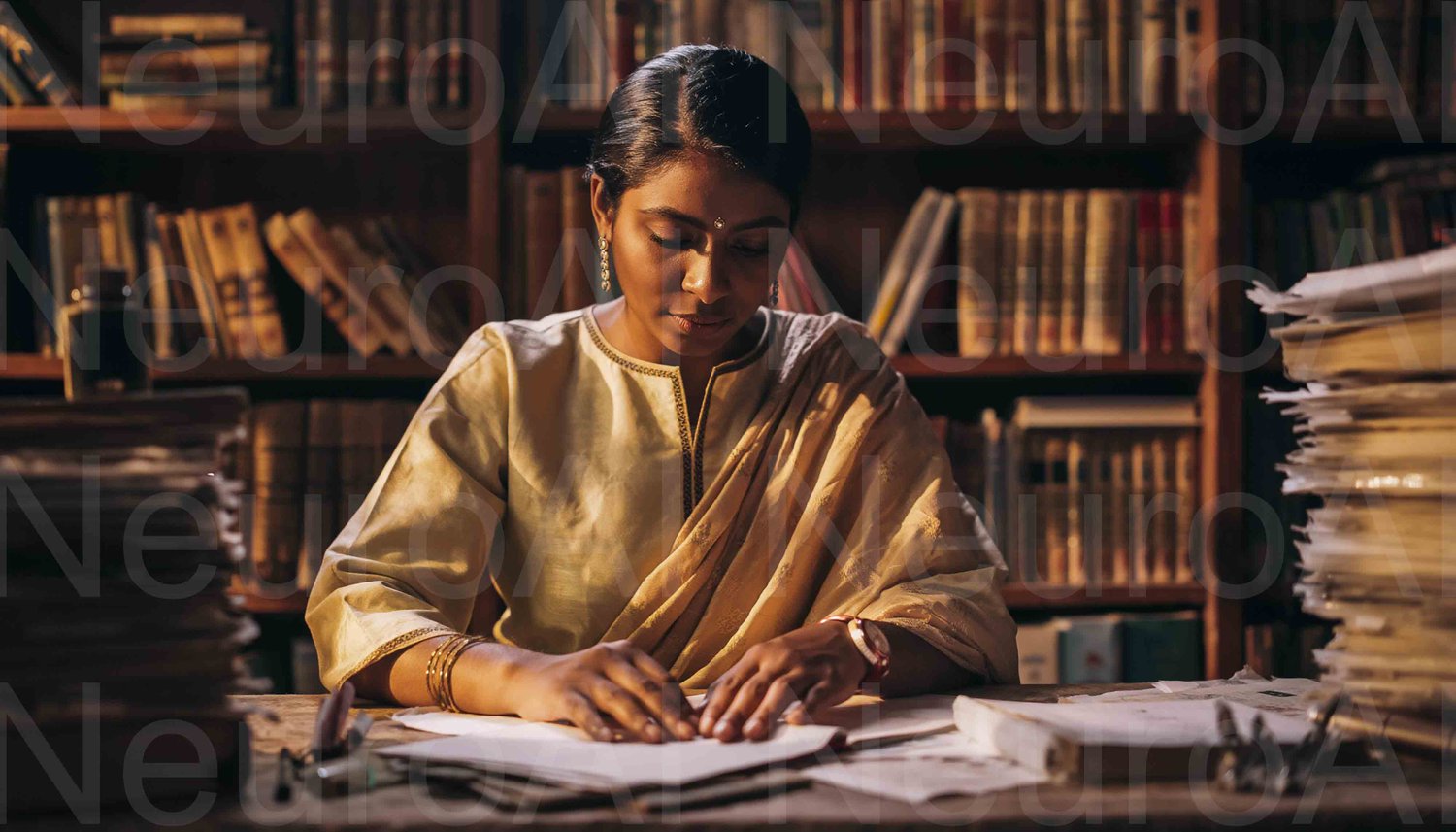 Thoughtful woman studying in library at antique desk