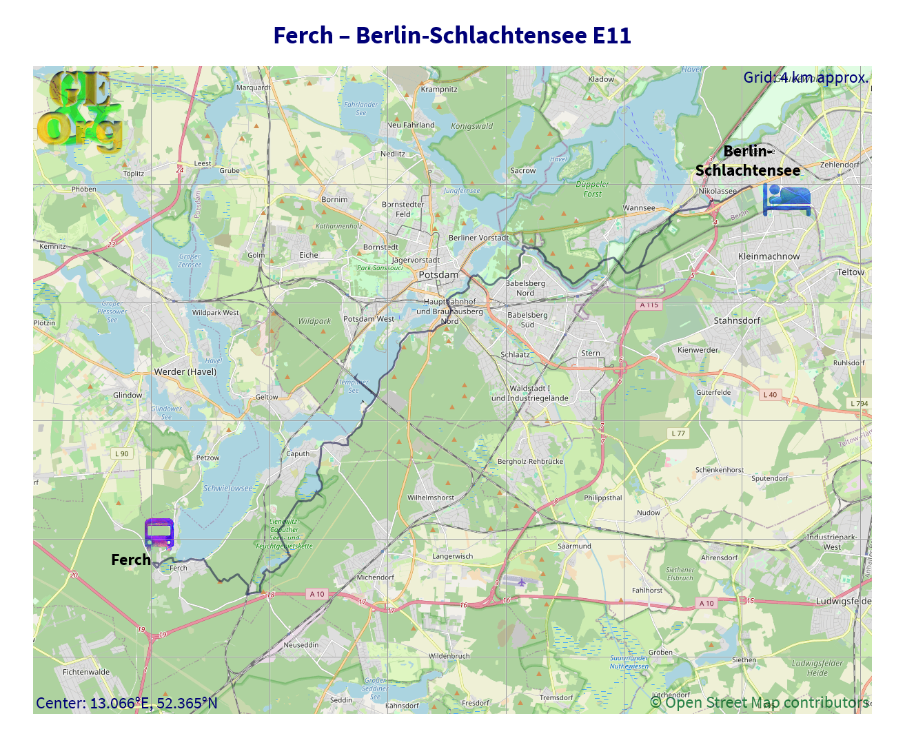 European Long Distance Hiking Path E11, Ferch - Berlin-Schlachtensee, one GPX file, one GeoJSON file, one OpenStreetMap image.