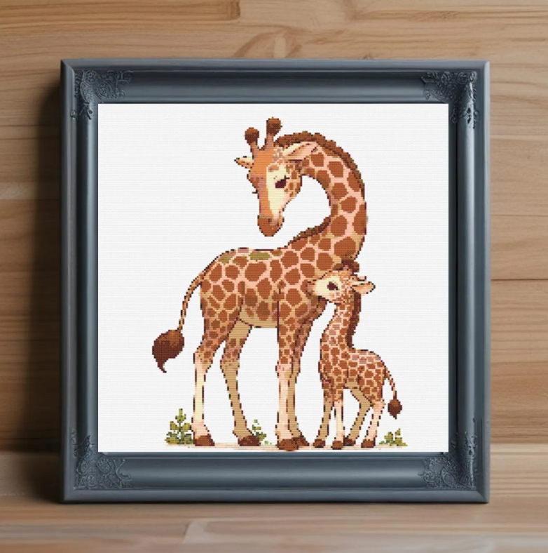 Stitch the heartwarming bond between a mother giraffe and her baby with this beautiful cross-stitch pattern. Perfect for animal lovers and embroidery enthusiasts alike, this design captures the gentle connection and elegance of these majestic creatures.