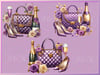 9 Purple and Gold handbags, Shoes, Champagne, Presents, Perfume png's