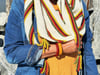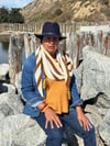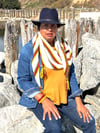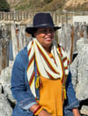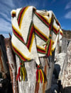 Worked in garter stitch, Autumn Bliss is a side-to-side, asymmetrical, triangular-shaped shawl knit on the bias. It features autumnal-colored stripes and a fringe of beaded i-cords at its three points. The dangling beaded i-cords sparkle in the sunlight, much like colorful leaves in autumn. Colors of the shawl include off-white as the main color with garter stitch stripes of goldenrod, chartreuse, burnt orange, red, dark violet, ivy green, and dark forest green.
