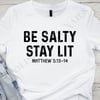 Share your faith with a bit of modern flair with this "Be Salty Stay Lit Matthew 5:13-14" t-shirt! This bold design features the impactful message "BE SALTY STAY LIT" in a strong, sans-serif font, followed by the scripture reference "MATTHEW 5:13-14."