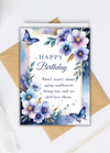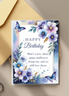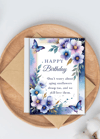Celebrate their special day with our beautiful 'Happy Birthday' card, featuring an elegant watercolor design of various shades of blue and purple flowers, accented by graceful butterflies. This card offers a sophisticated look with a touch of whimsy.
