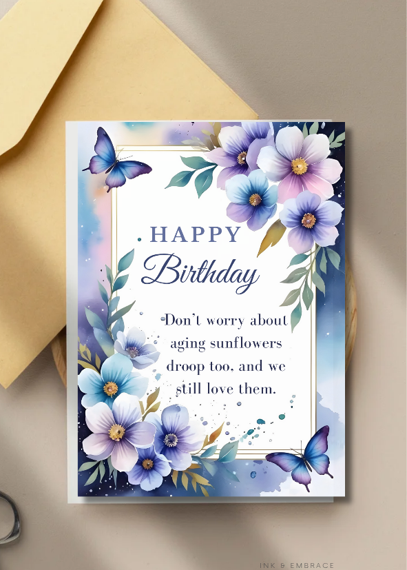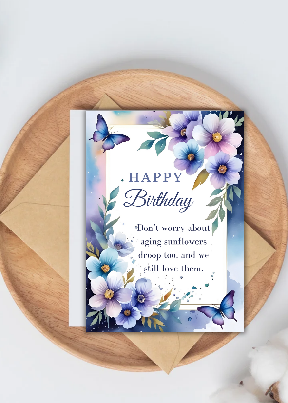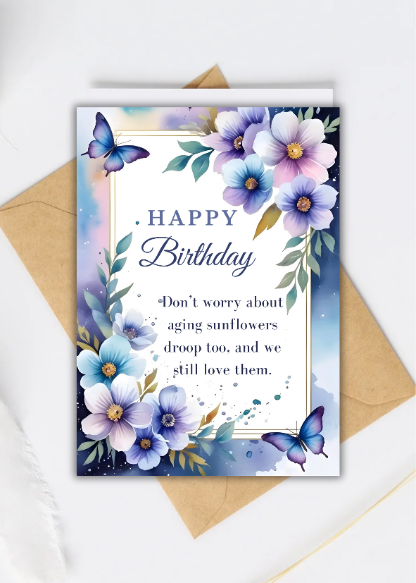 The thoughtful and uplifting message inside reads: 'Don't worry about aging sunflowers droop too, and we still love them.' It's a gentle and comforting reminder, perfect for those who appreciate a more subtle, yet meaningful, sentiment on their birthday.