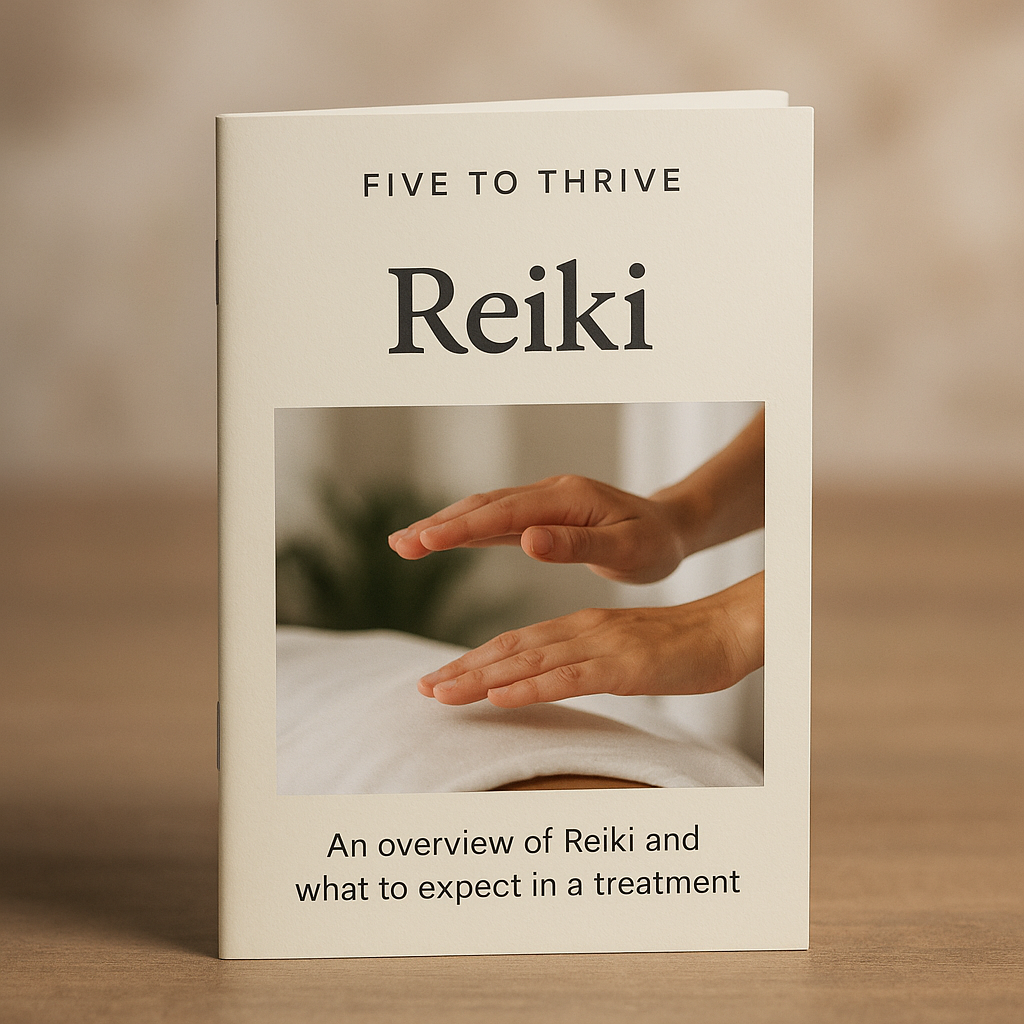 Discover the gentle yet powerful world of Reiki with this Five to Thrive guide. Inside, you’ll find a clear, practical overview of what Reiki is, how it works, and the unique benefits it offers for healing and balance. Whether you’re curious about receiving your first treatment or simply want to understand this energy-based practice more deeply, this booklet takes the mystery out of the process. Learn what to expect during a session, how Reiki supports emotional, mental, and physical well-being, and why so many people turn to it for stress relief, clarity, and inner harmony.