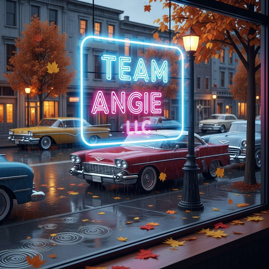 This mesmerizing piece transports you to a classic downtown street at twilight, where vintage automobiles gleam under the soft glow of streetlights and the wet, reflective pavement. Dominating the scene is a vibrant neon sign, casting an electric pink and blue aura that boldly declares "TEAM ANGIE LLC."