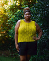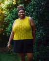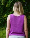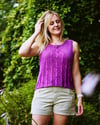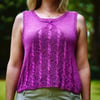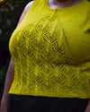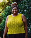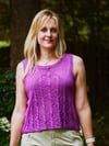 This slightly cropped tank features a triangular lace panel with easy cables that is worked only in the front, and both charts and written instructions for the panel are included. Construction is from the bottom up and is worked in one piece. At the armhole separation, the front and back are worked back and forth separately, and the shoulders are grafted together. Instructions for how to add length are included.