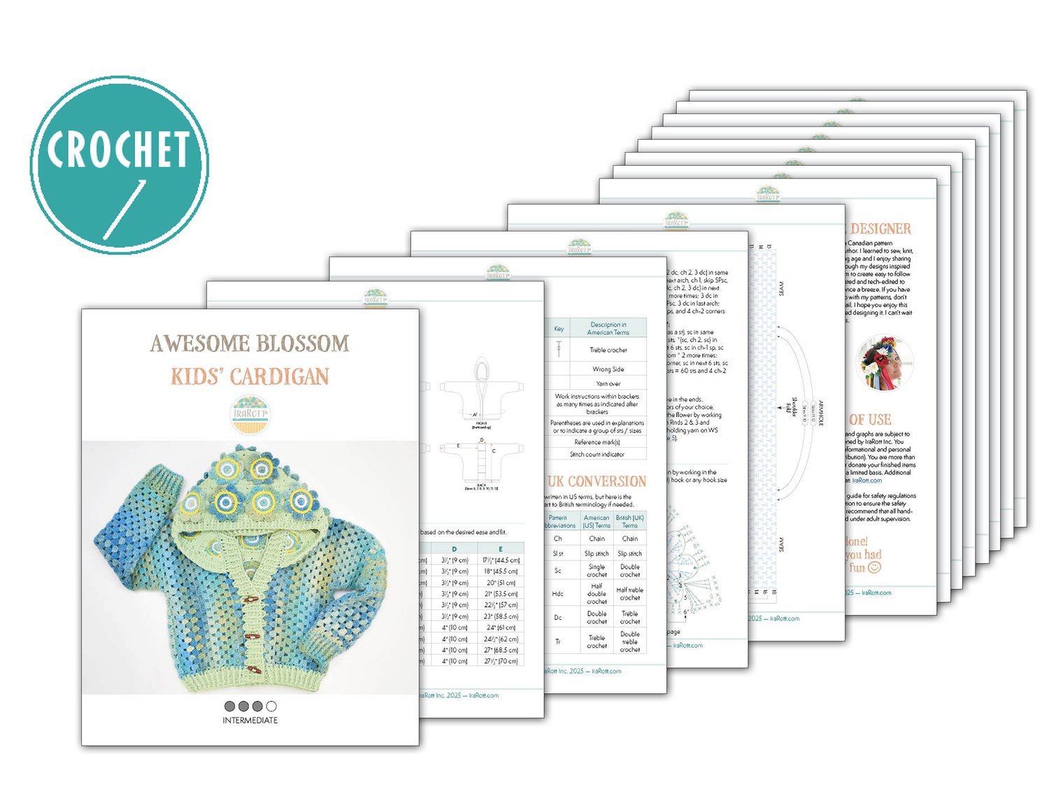 This Awesome Blossom Kids' Cardigan includes 10 sizes, ranging from 3 to 12 years. It is worked from the center-back out to the sides and sleeves. The sides on the body and the hood are joined using a crochet hook, eliminating the need for any sewing (except when attaching buttons). While the hood is a centerpiece of this design, there are some tips if you want to make your cardigan without it. The instructions are written using standard American terms, along with crochet diagrams, step-by-step photos, and a conversion chart to UK terms. This pattern is professionally written, tested and tech-edited to make your crafting experience a breeze.