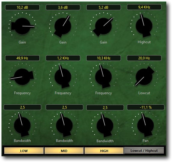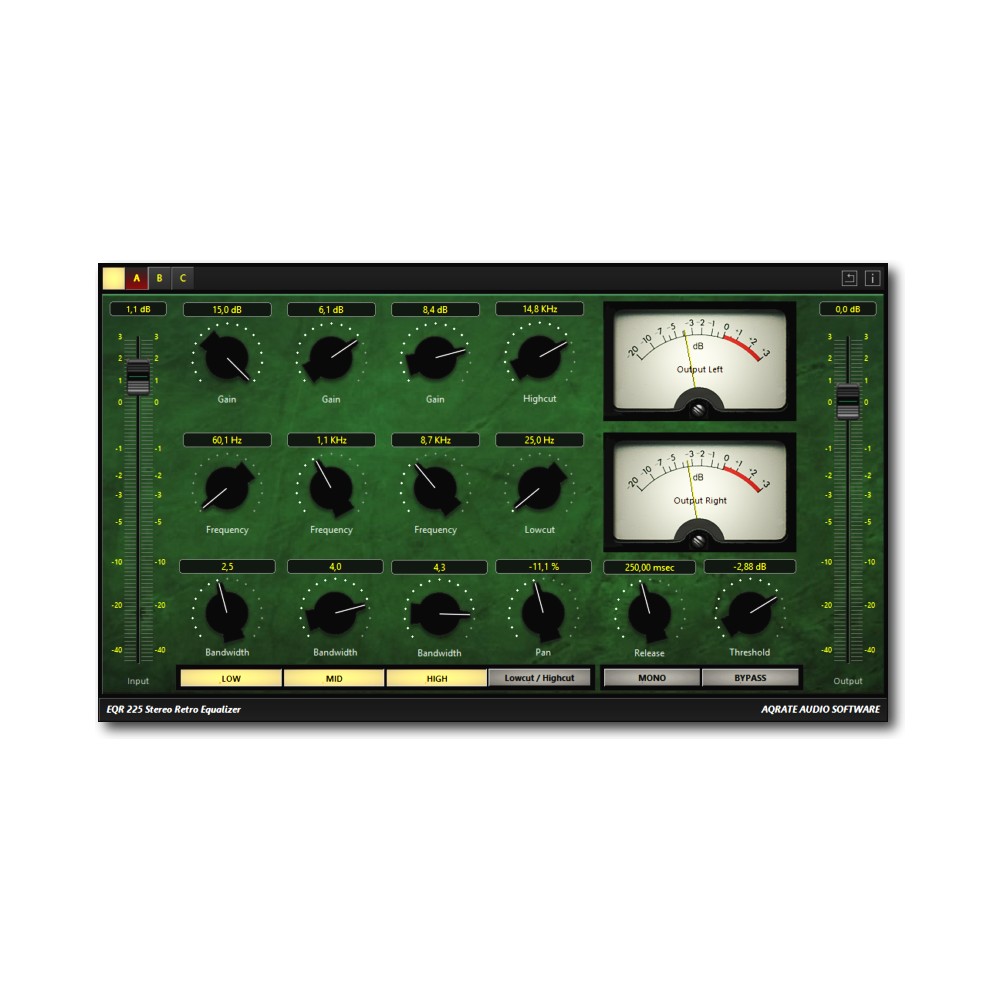 The Retro Equalizer EQR-225 is a combination of a 3-band equalizer and a limiter / compressor, both with a straight tube character. With our new algorithms this little tool creates a very bold and punchy sound by low cpu usage. How much compression you want is adjusted by the input slider. Than more input you give than more compression will be generated.
