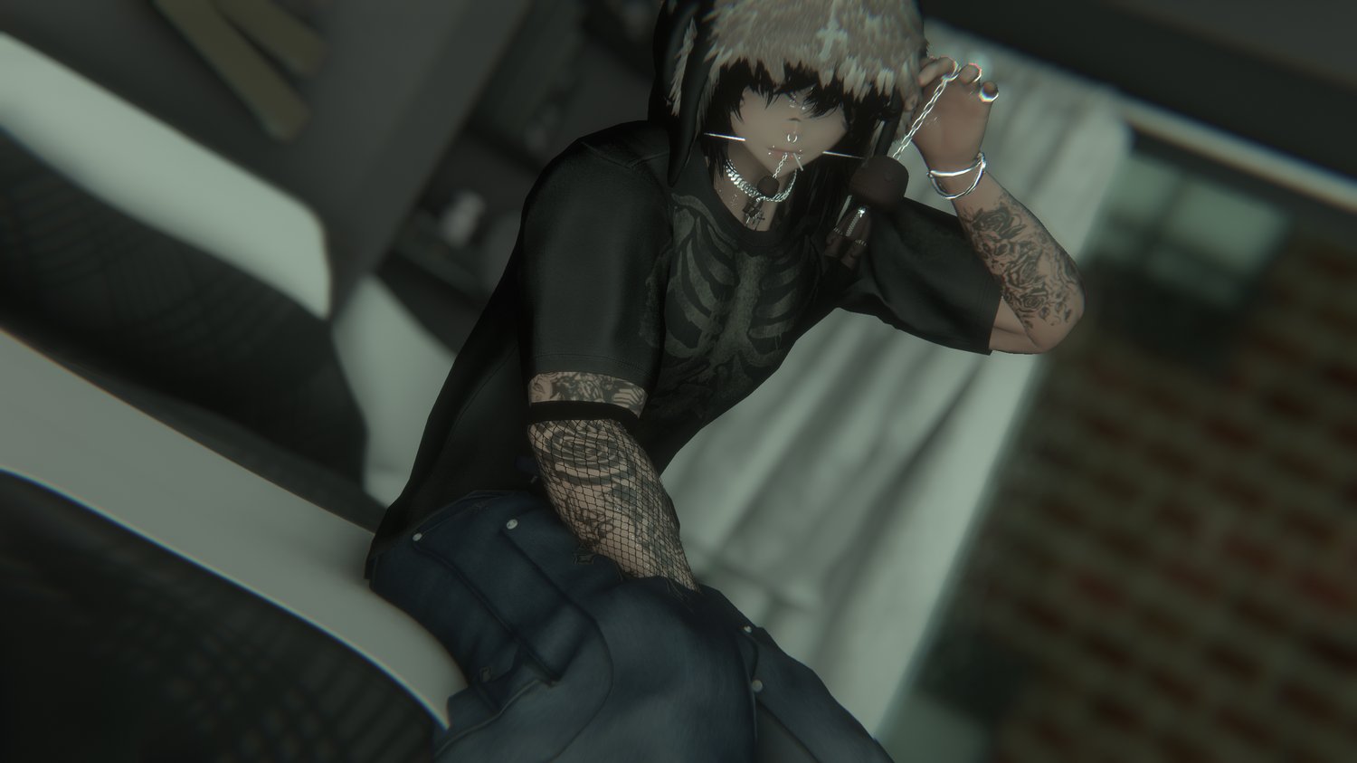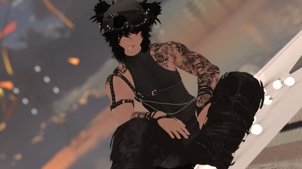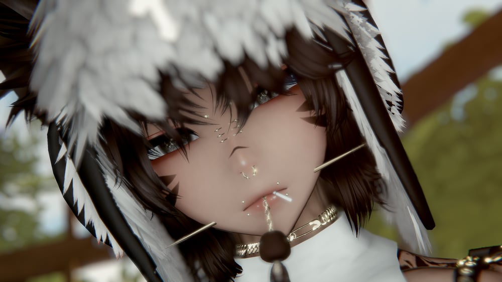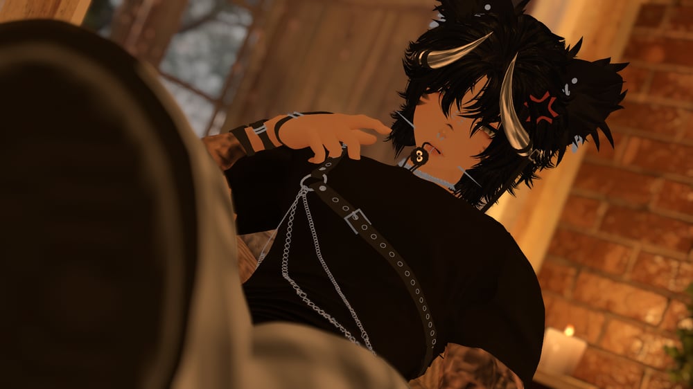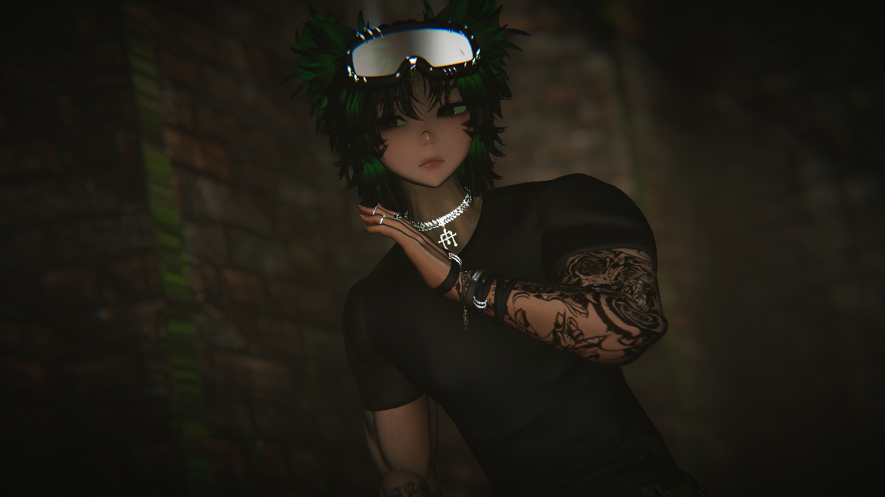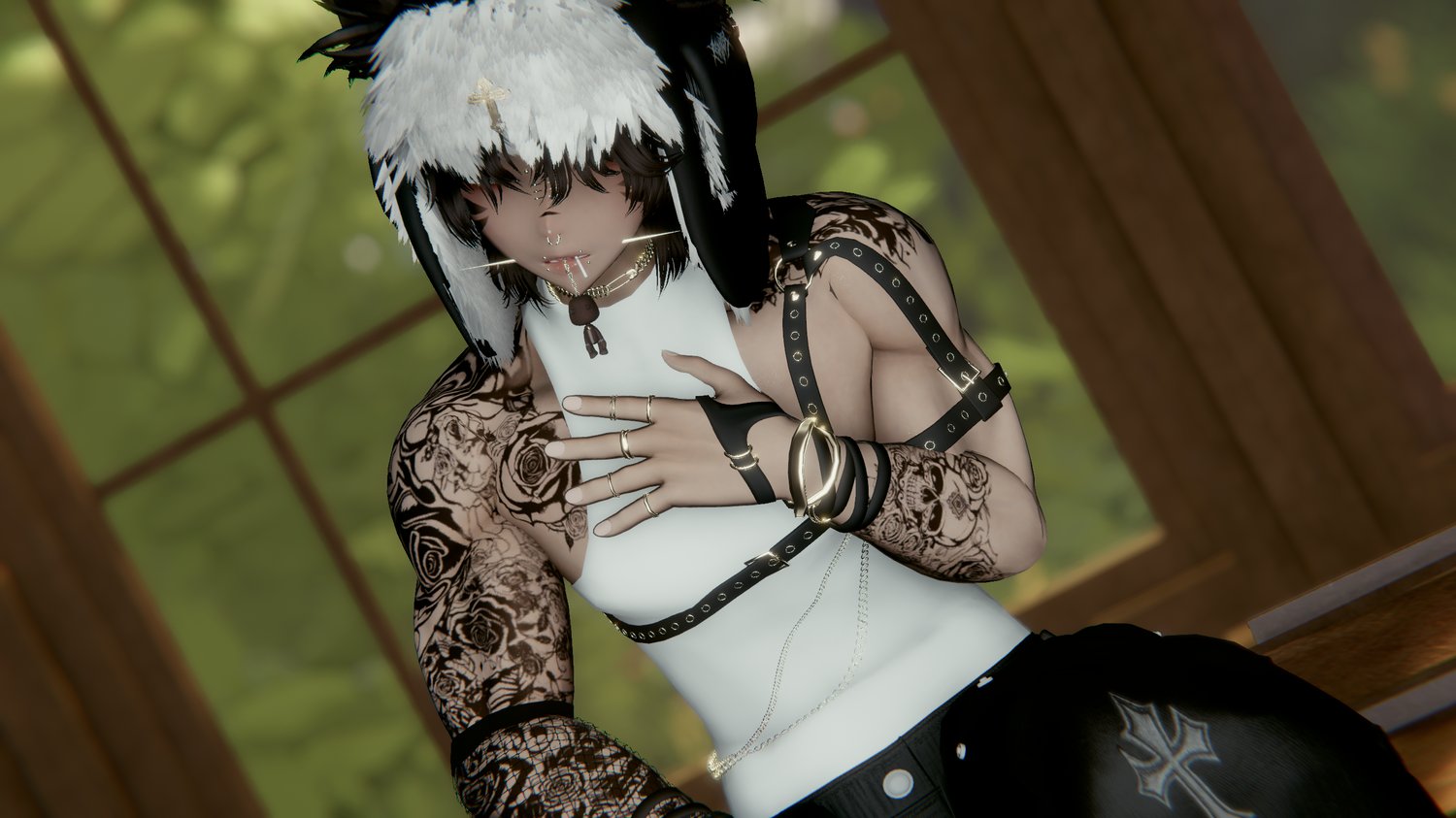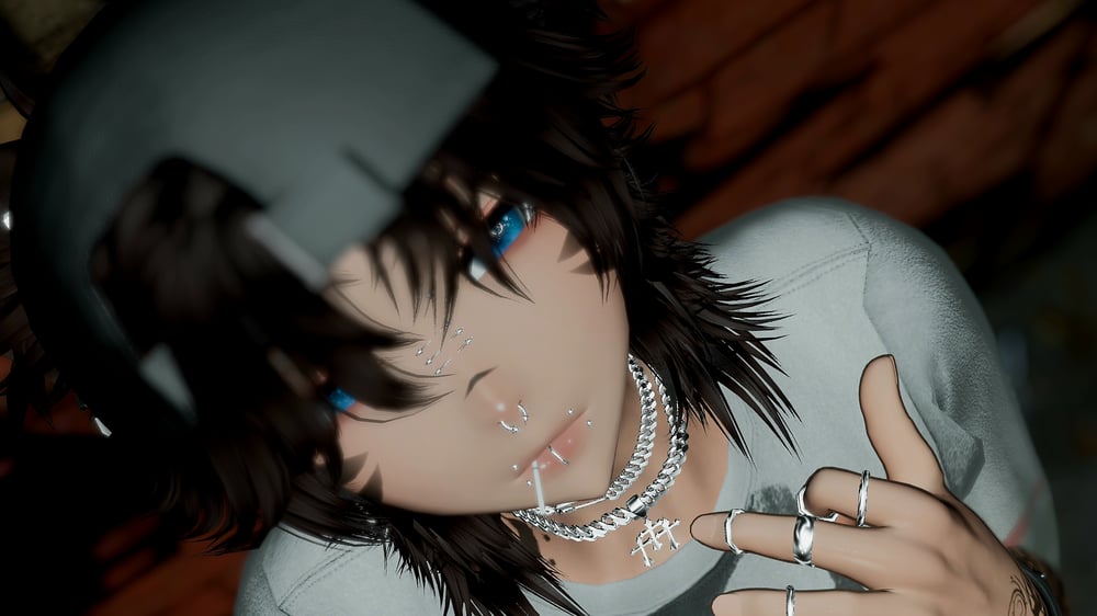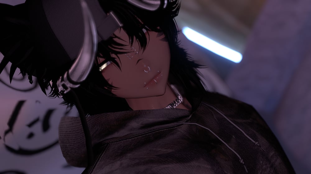 Accessories: Body Harness-pokerblunders, Backwards Hat-Nessy, Fluffy Hat-zoxl, Goggles-lunaraii, LoliPop-ai, Mouth Keychain-mayura, Mouth Sprite-gorekittwn, Piercings-24am, Arm Fishnet, Rings-anaram, Left Bracelet-Zinpia, Right Bracelet-anaram, Worm toy-hugandlove, Finger KeyChain-mayura, Hip KeyChain-mrsauce01, Neck Chain 1-alces, Neck Chain 2-alces, Belt-Freshvrc, Blindfold-ArturVR, Gumboy-GumboIsland