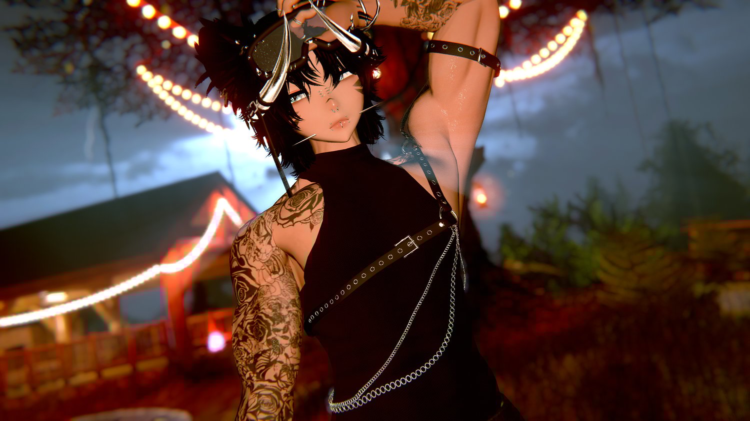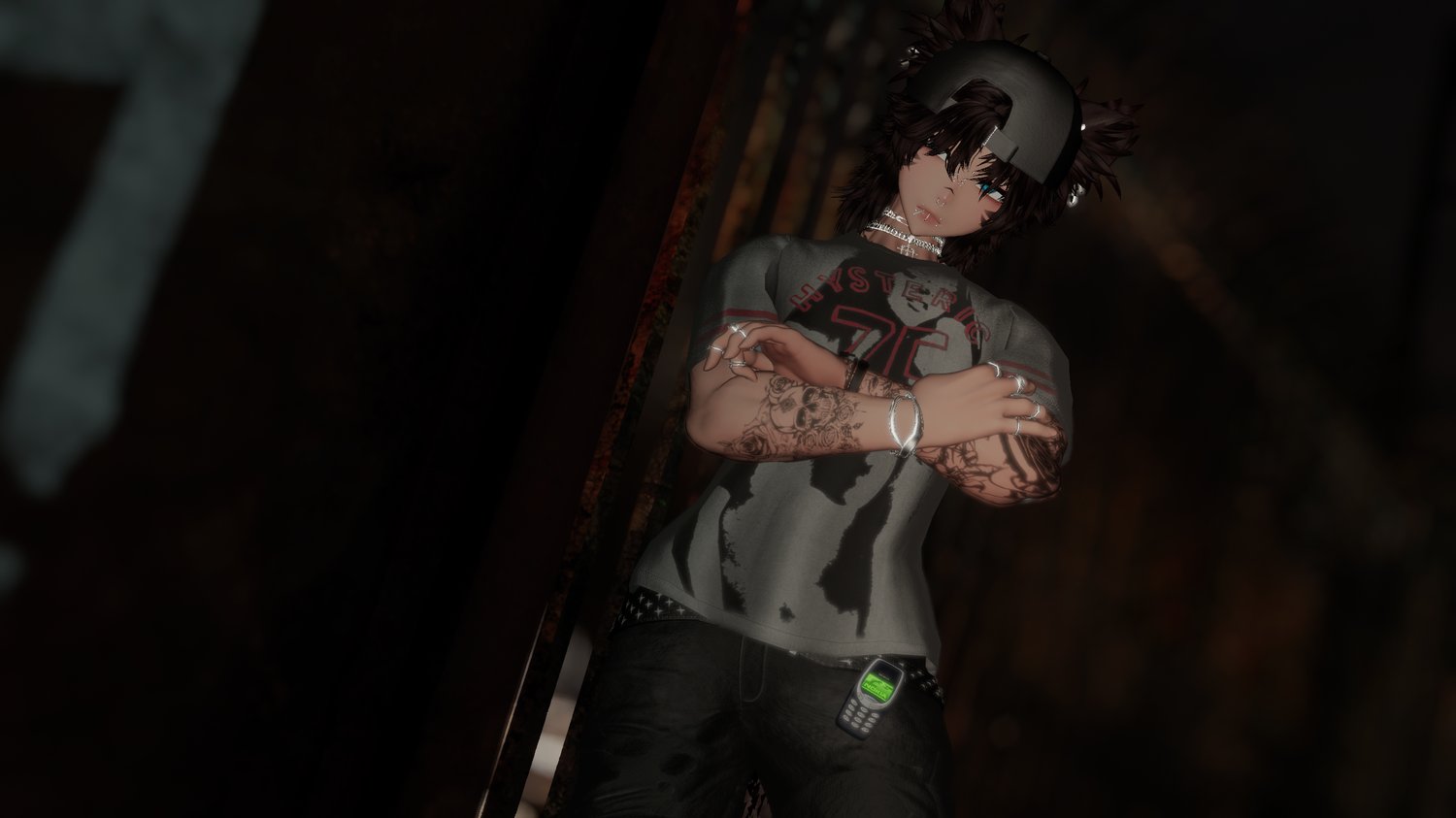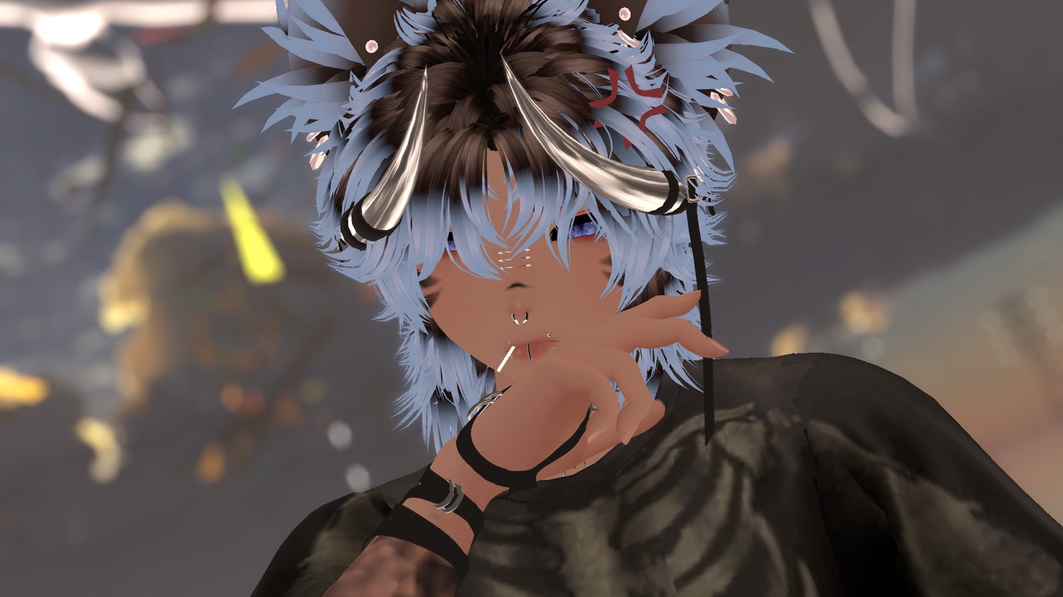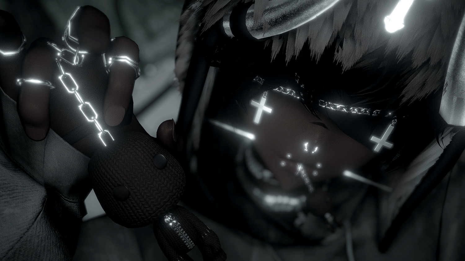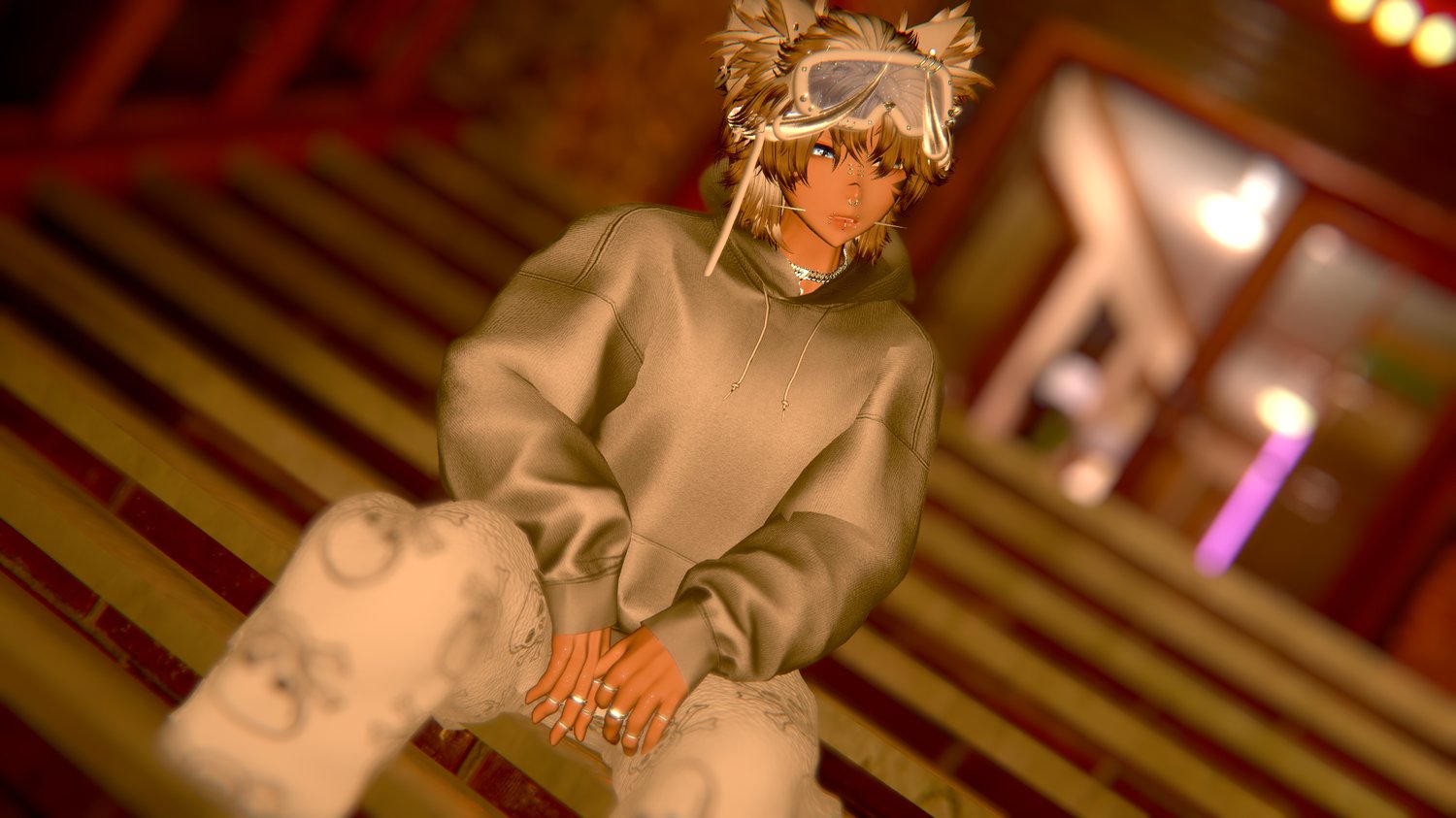 Accessories: Body Harness-pokerblunders, Backwards Hat-Nessy, Fluffy Hat-zoxl, Goggles-lunaraii, LoliPop-ai, Mouth Keychain-mayura, Mouth Sprite-gorekittwn, Piercings-24am, Arm Fishnet, Rings-anaram, Left Bracelet-Zinpia, Right Bracelet-anaram, Worm toy-hugandlove, Finger KeyChain-mayura, Hip KeyChain-mrsauce01, Neck Chain 1-alces, Neck Chain 2-alces, Belt-Freshvrc, Blindfold-ArturVR, Gumboy-GumboIsland