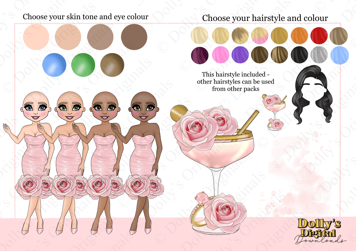 Instant digital download of our Blushing Bride Pale Pink Rose Cocktail Dolly Character Bundle PNG (34 PNG’s)