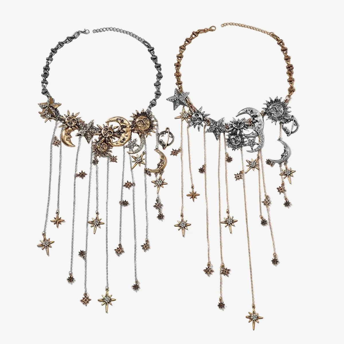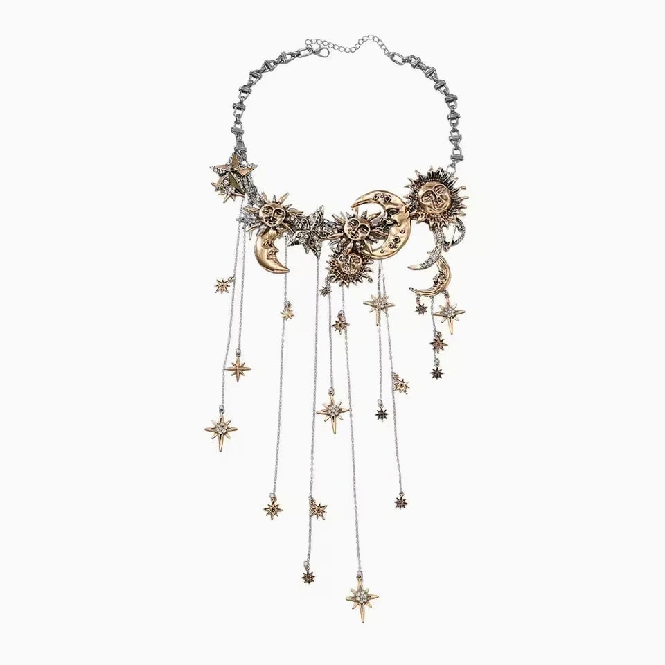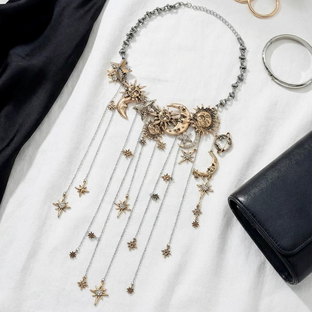 Celestra™ drapes cascading celestial chainsacross your neckline—sun, moon, and stars falling in soft layers. The kind of piece that makes strangers pause. Ask where you got it. Tell you it's beautiful.