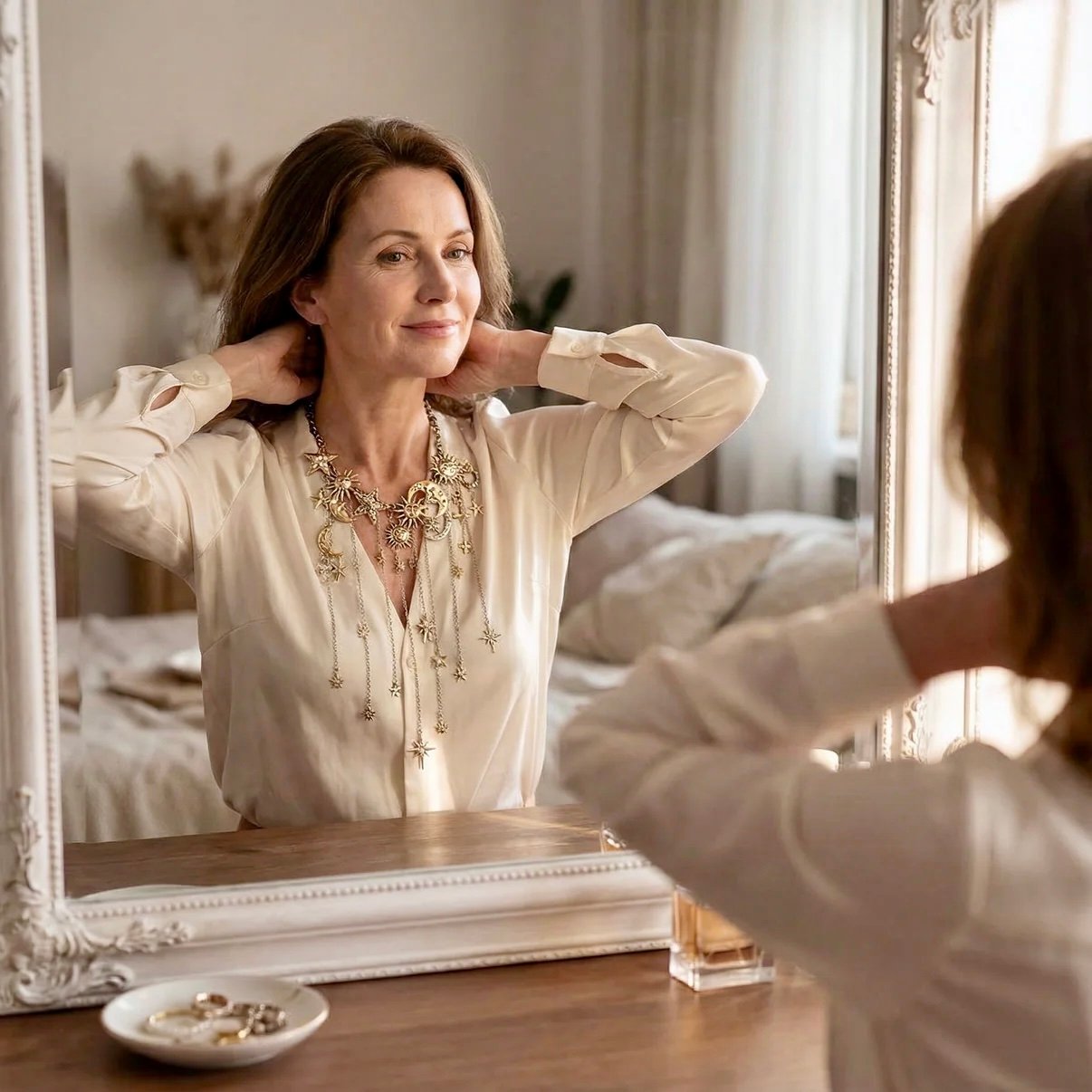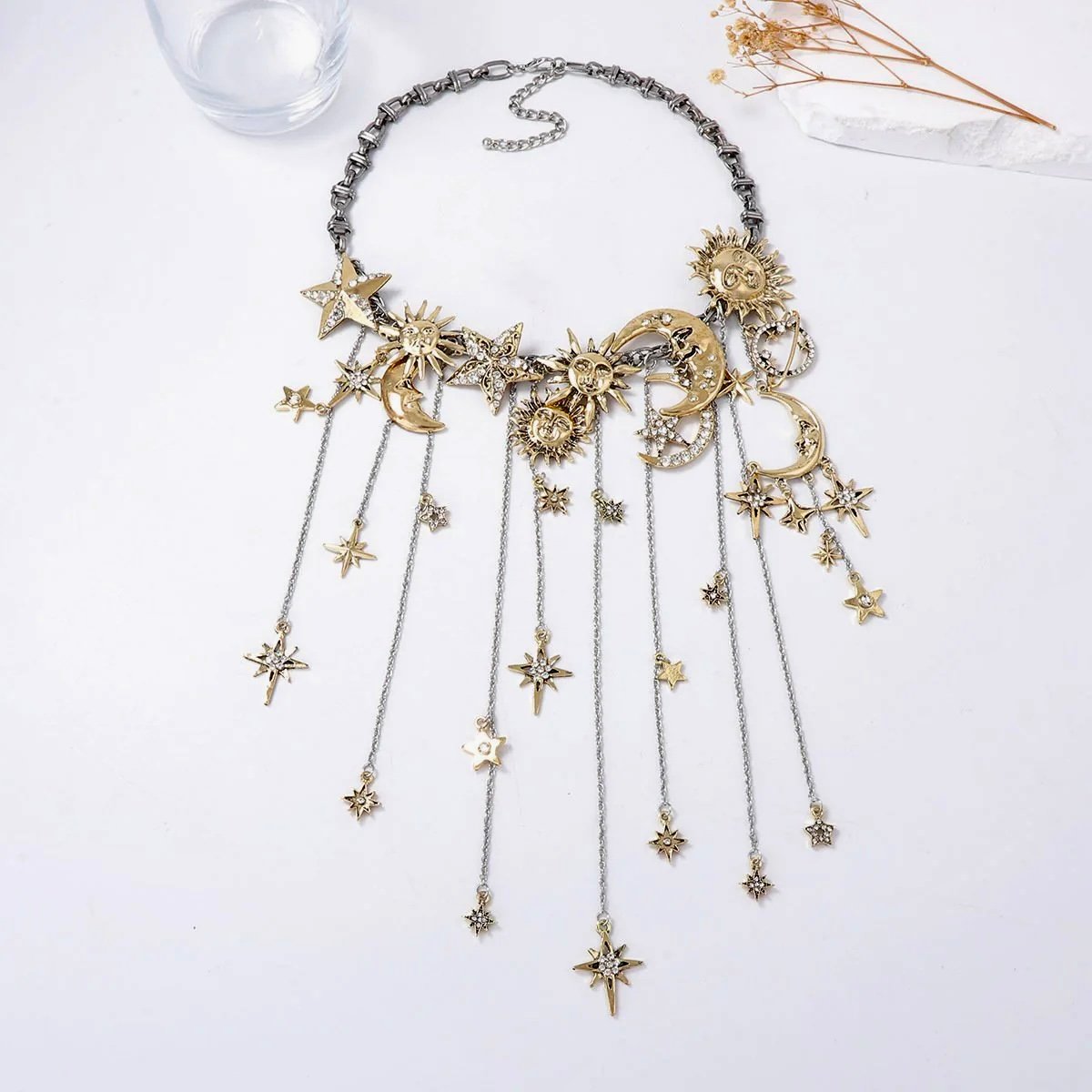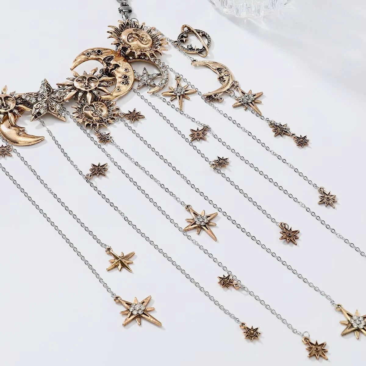 Celestra™ drapes cascading celestial chainsacross your neckline—sun, moon, and stars falling in soft layers. The kind of piece that makes strangers pause. Ask where you got it. Tell you it's beautiful.
