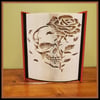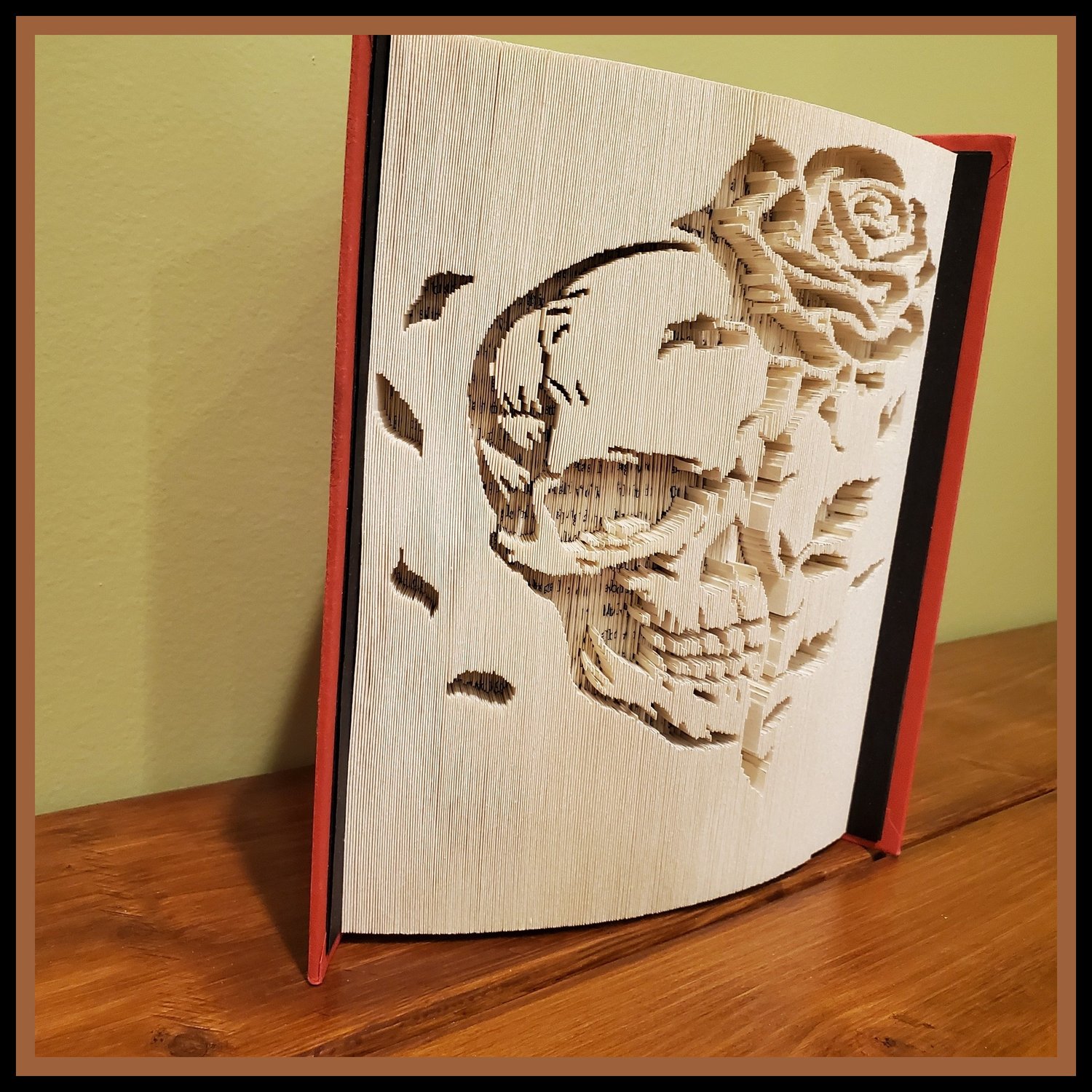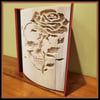 This dramatic folded book art pattern features a striking skull with a detailed rose, blending edgy gothic style with elegant floral beauty. The contrast between the delicate rose and bold skull creates a powerful artistic statement symbolizing the balance between life, beauty, and transformation.