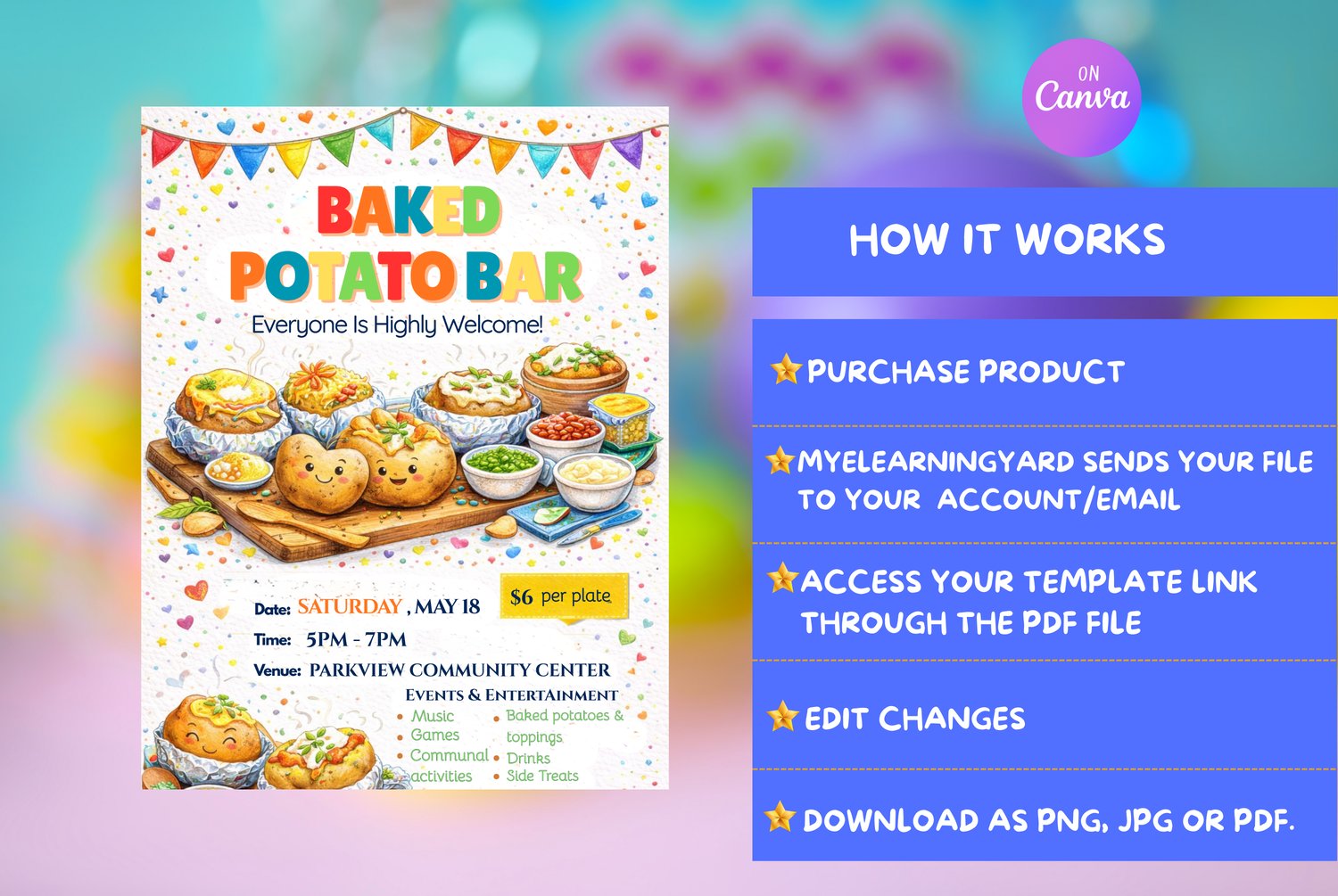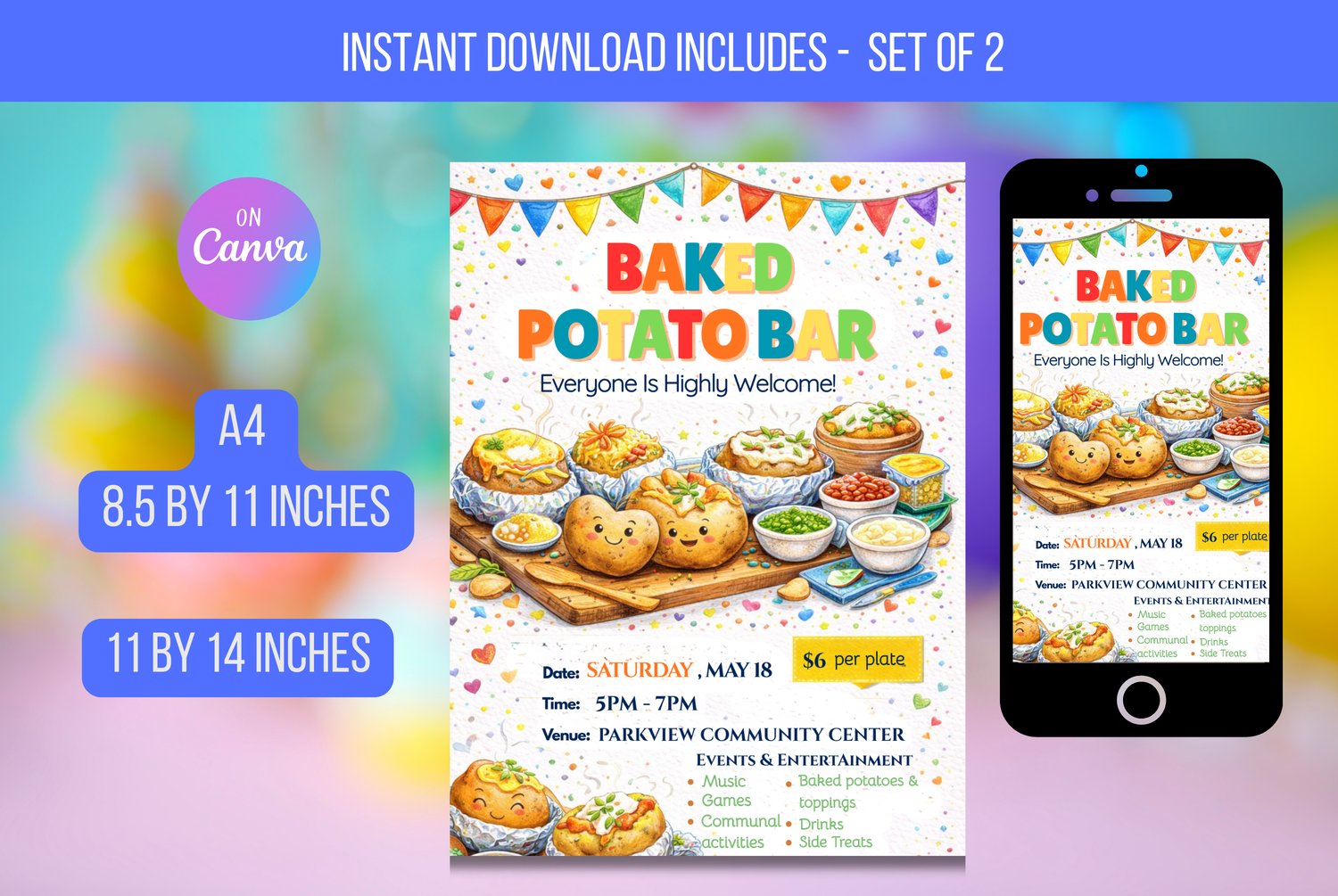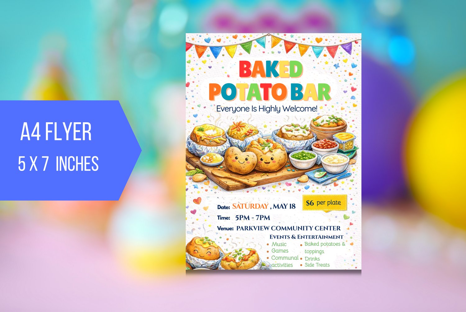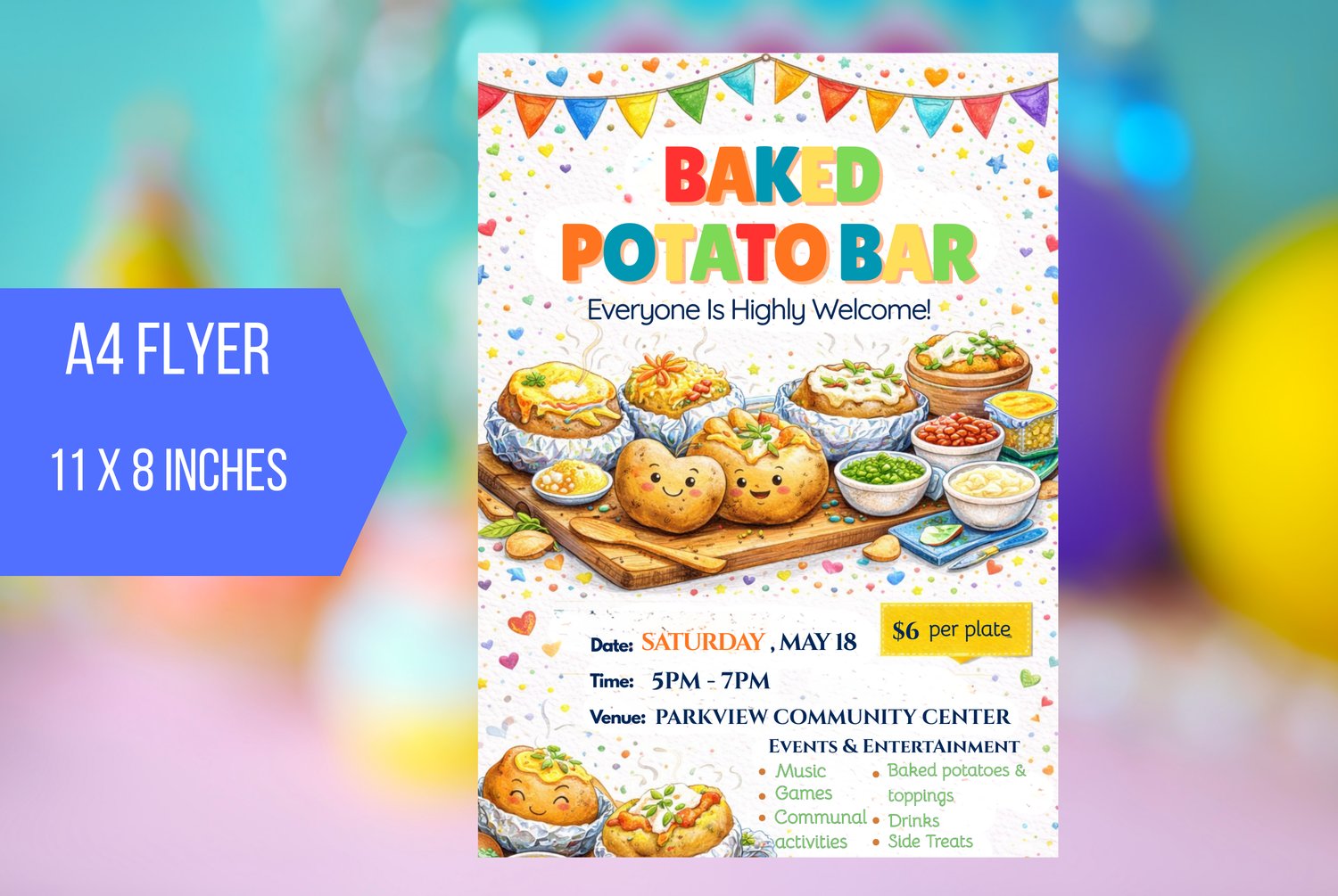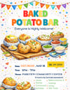 The flyer features cute illustrated baked potatoes with tasty toppings like cheese, sauces, and fresh garnishes. Bright colours, playful details, and festive decorations help the flyer stand out and create a happy, welcoming mood. The layout is simple, making it easy for people to see all the essential event information at a glance.