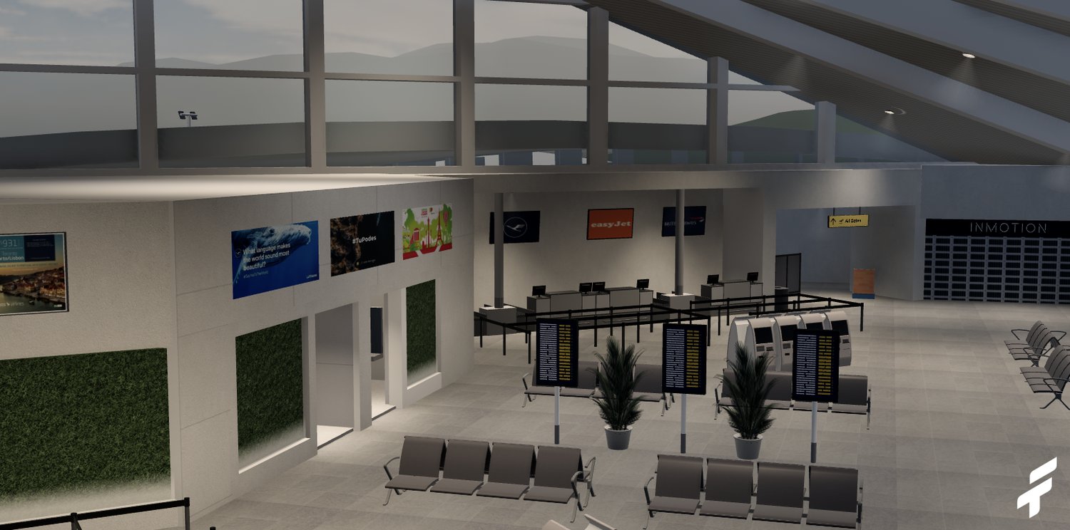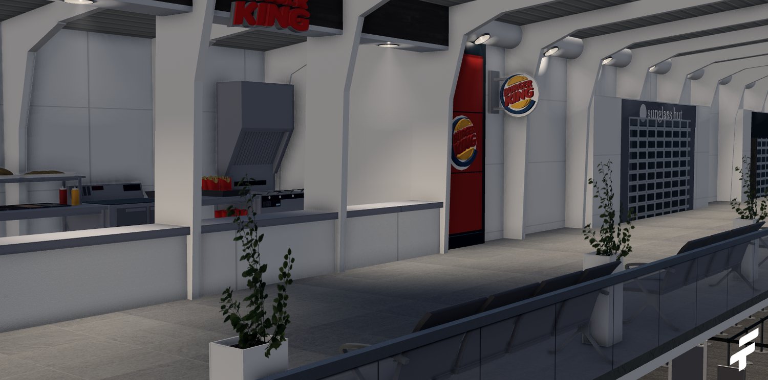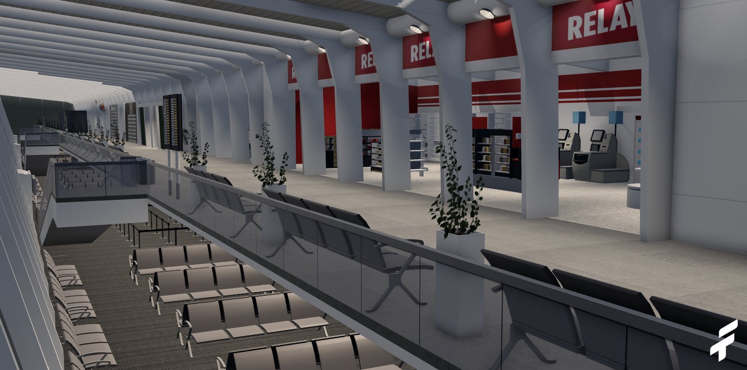 -Detailed interior with check-in, security, gate areas, airport stores, and a basic lounge.