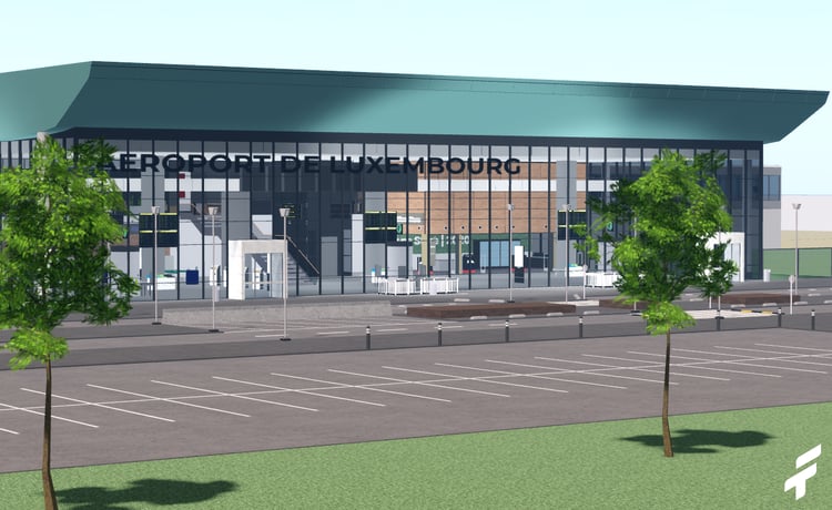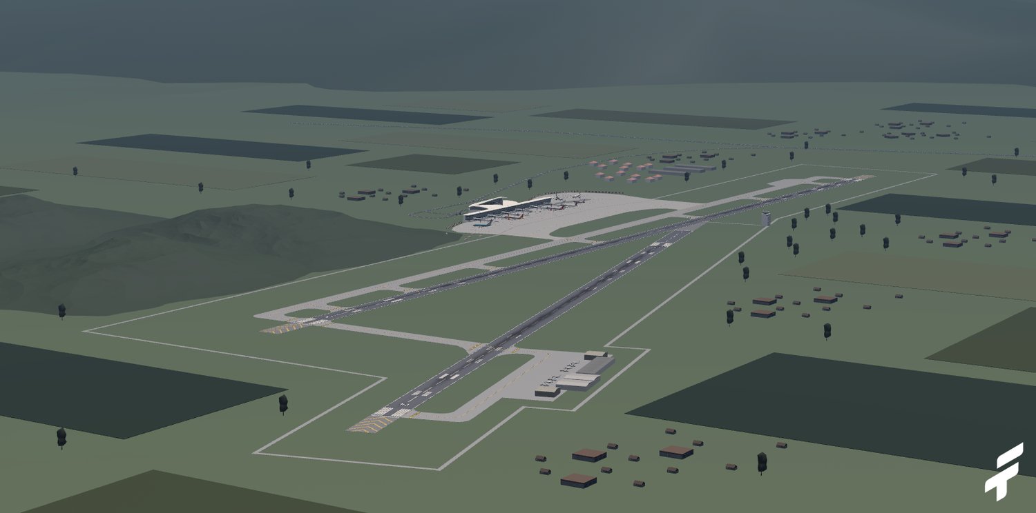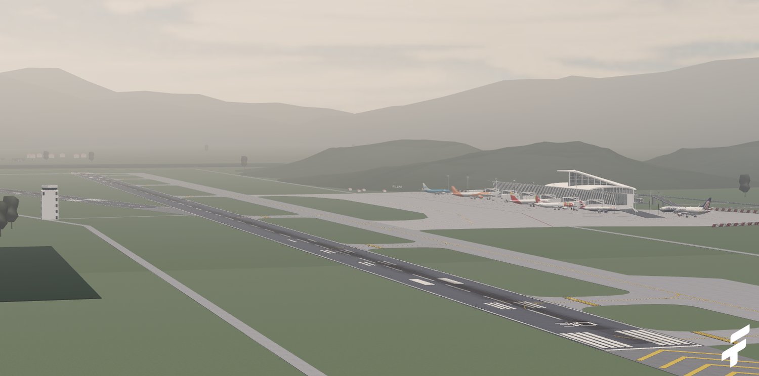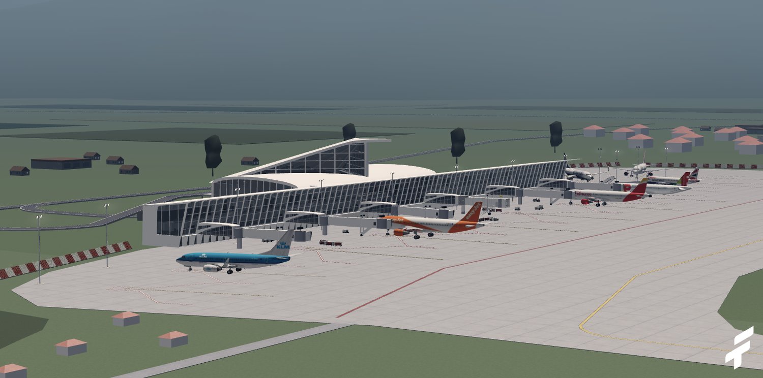 -Detailed interior with check-in, security, gate areas, airport stores, and a basic lounge.