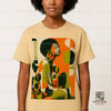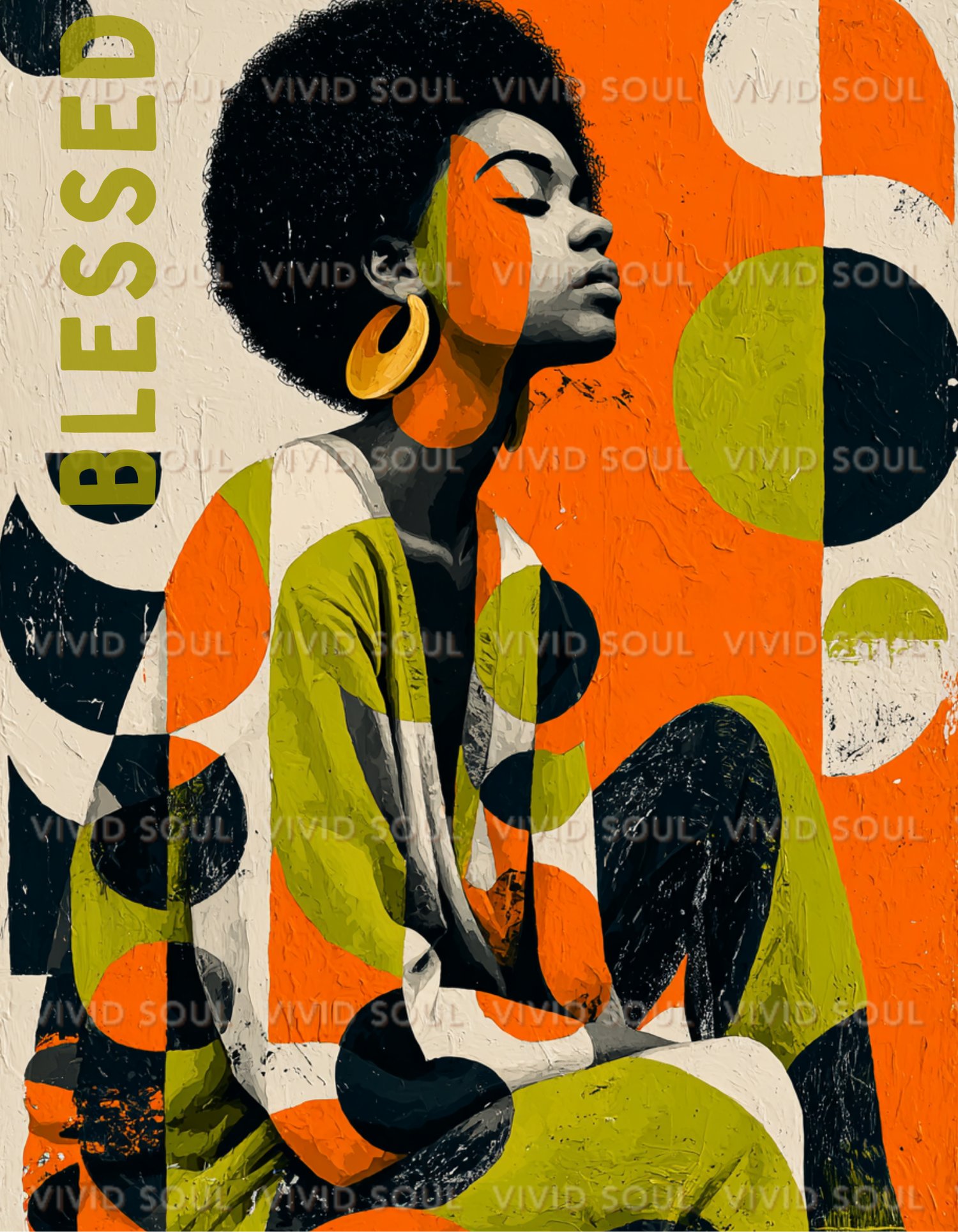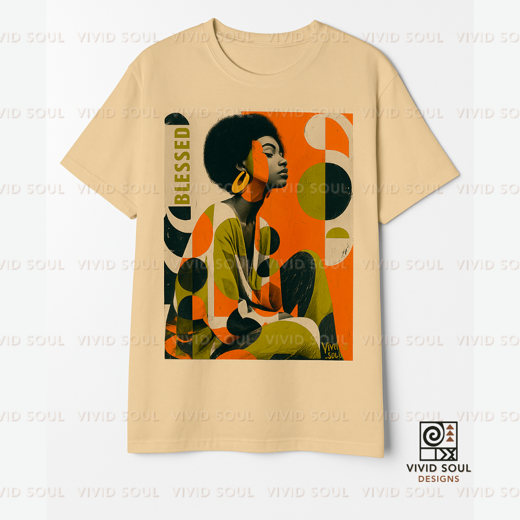 Step into purpose and power with our “Blessed” tee, showcasing striking Afrocentric art in warm shades of orange, olive, and cream. Set against a cream shirt, this design embodies the grace of a confident Black woman surrounded by abstract shapes, paired with the word BLESSED as your daily mantra.