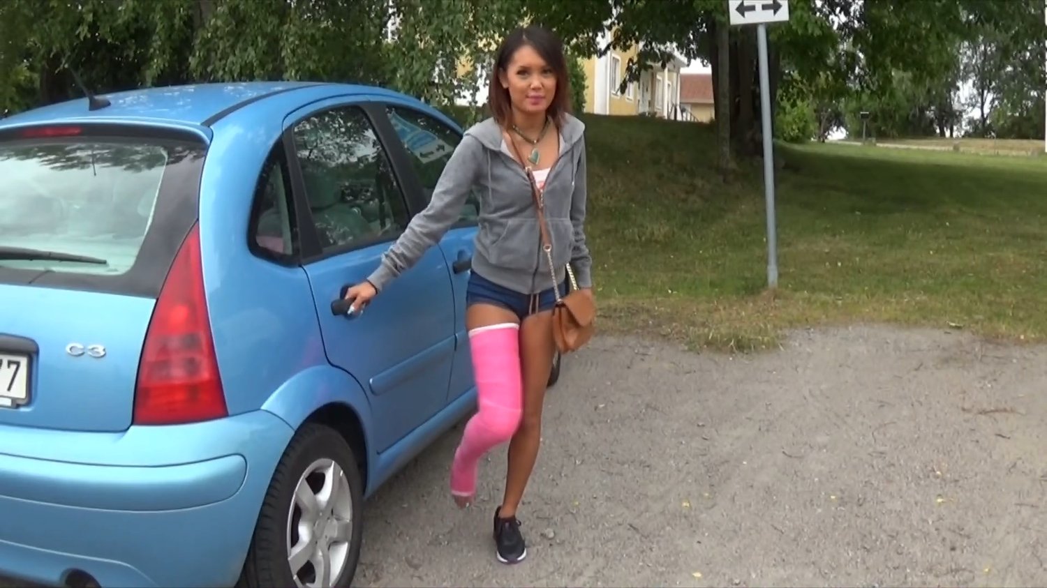 Bunny is on her way home with a LLC on her right leg and is now crutching from the car and up some stairs in her neighborhood before she enter the house and must crutch up some more stairs to her apartment