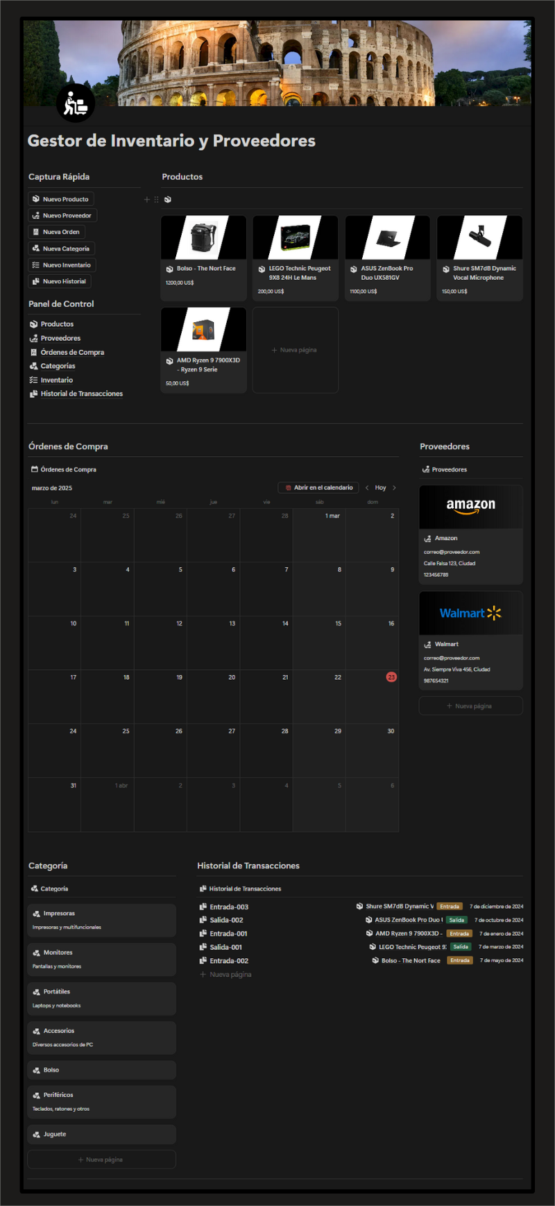Optimiza tu gestión de inventario y proveedores con nuestra plantilla "Gestor de Inventario y Proveedores" para Notion. Esta herramienta está diseñada para ayudarte a organizar, controlar y hacer un seguimiento eficiente de tus productos y transacciones comerciales.