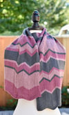VIBE is a bold striped scarf knit in three colors. Starting from a garter stitch border, this wrap features a semi-chevron pattern with a slipped stitch and garter stitch edging.