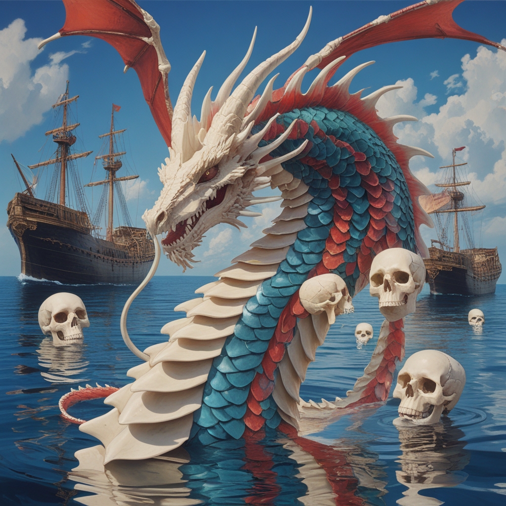 A striped dragon’s scales transition into bone petals while acrylic tendrils weave between ships at sea. Each stripe edge becomes a reflective boundary where the heroine and skulls reappear in diminishing alignment.