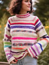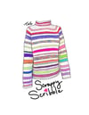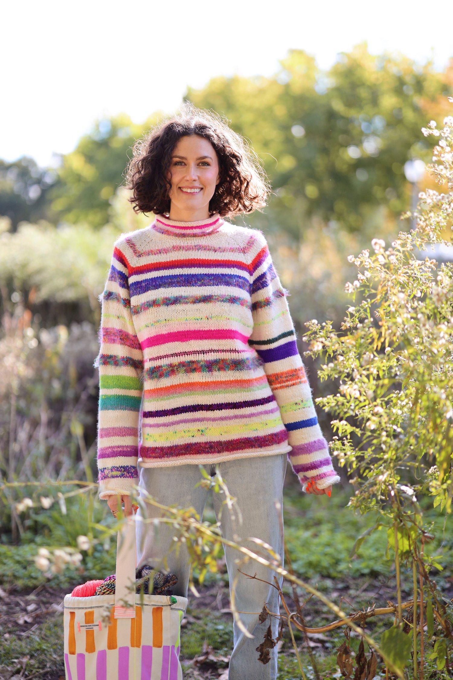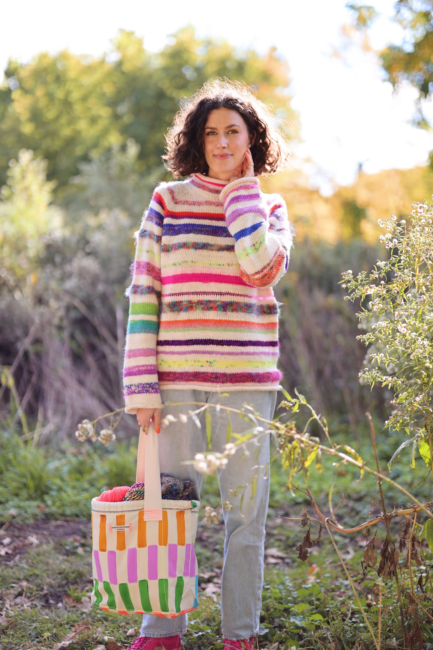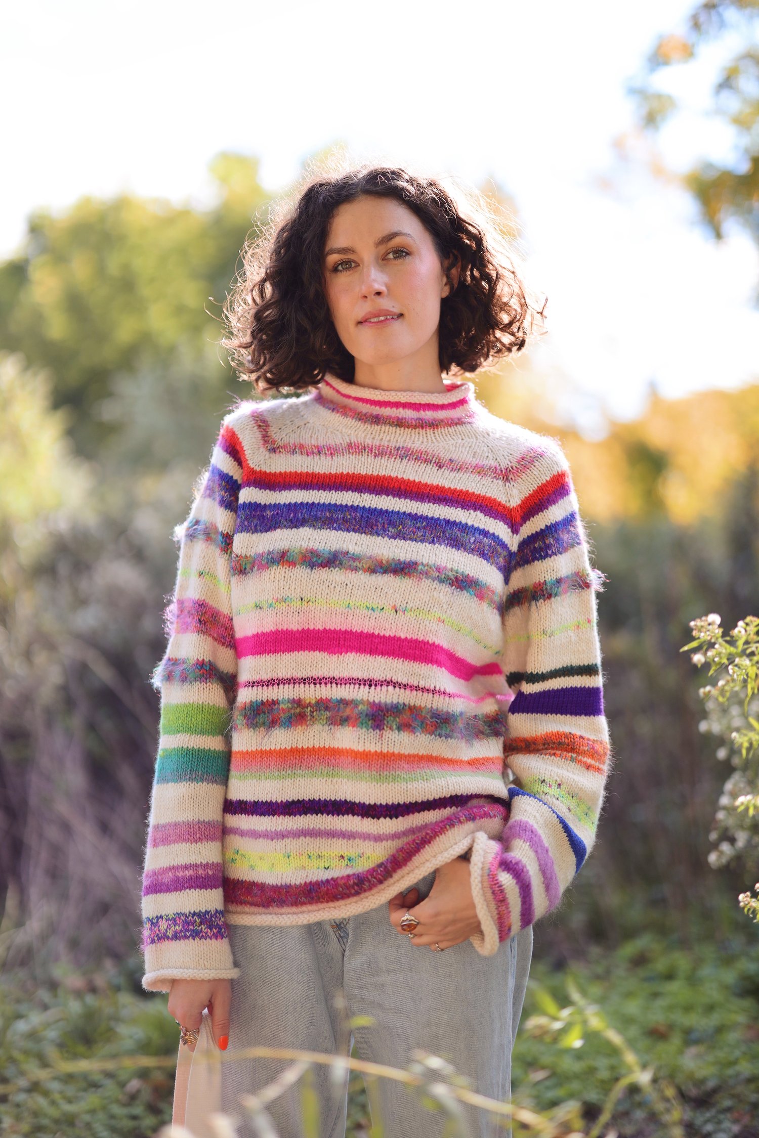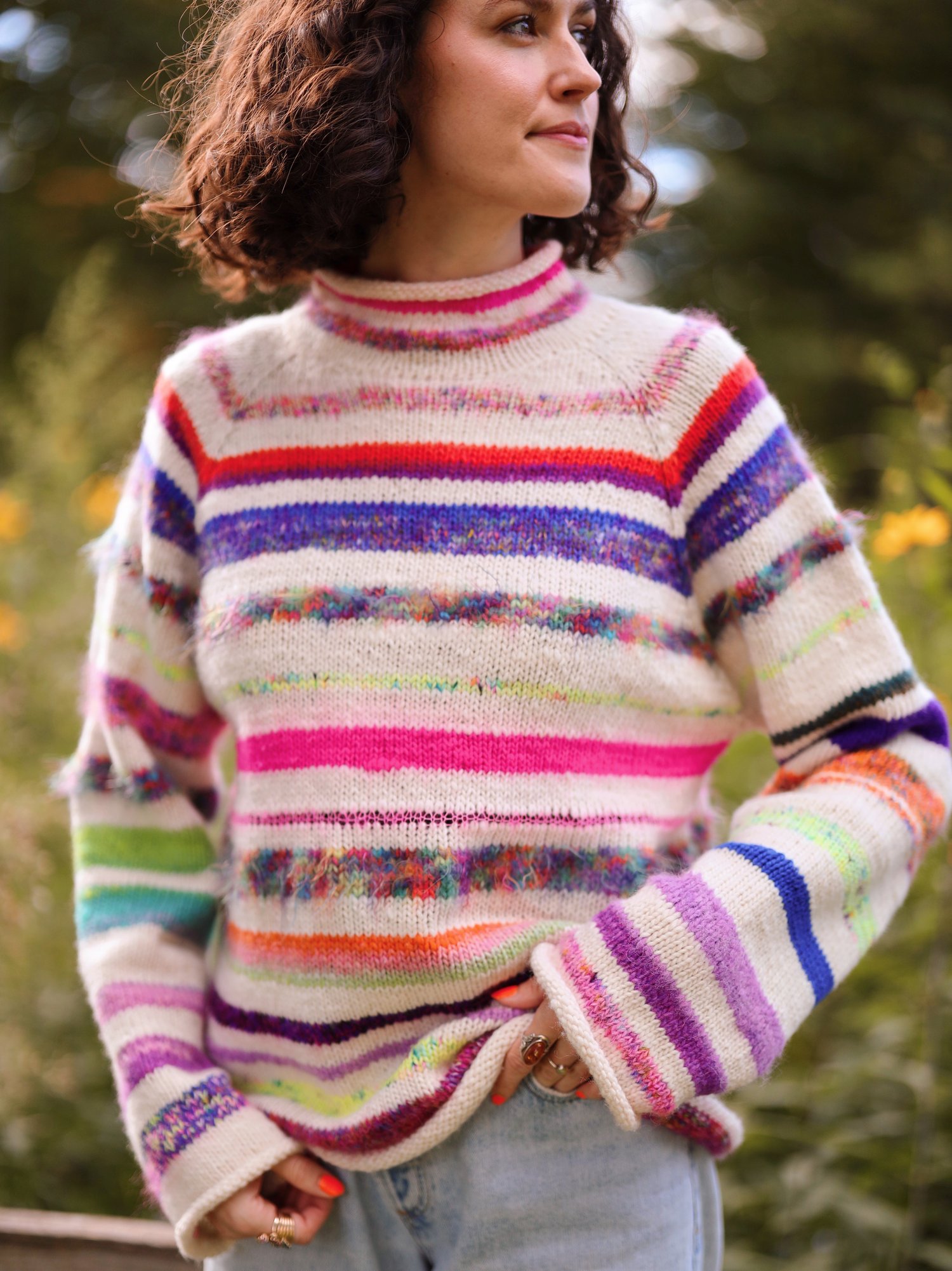 The Scrappy Scribble Sweater emboldens you to channel your inner child and scribble outside the lines! Play with color, play with fiber, play with different yarn weights, play with your stash & scraps! This oversized raglan sweater is worked from the top down, using a single worsted weight yarn as the base and then creating playful marled, rainbow stripes by holding different yarns together and switching/swapping as you go. Creativity is fun and important!!!! Perfectionism begone!!!!!!