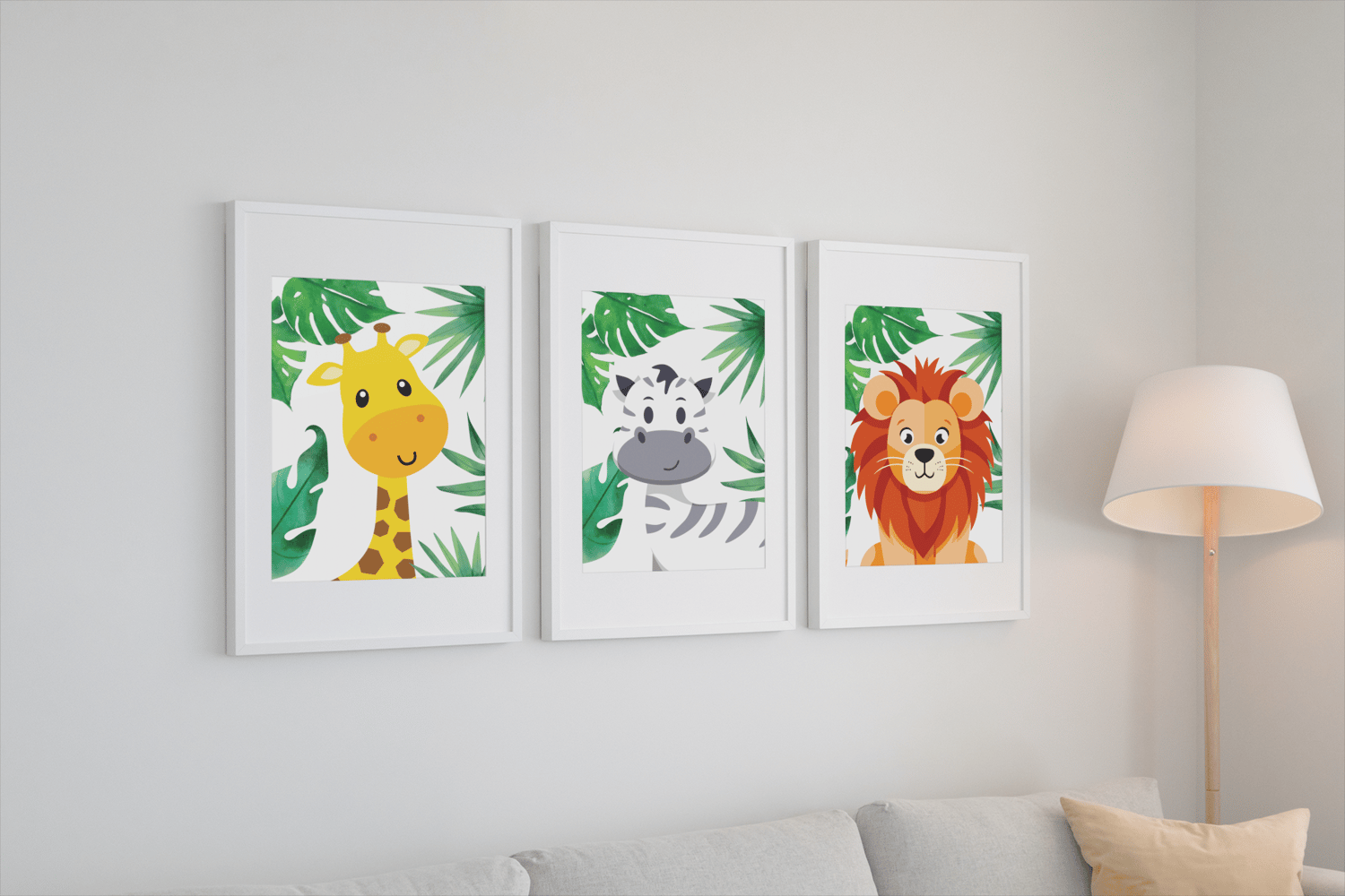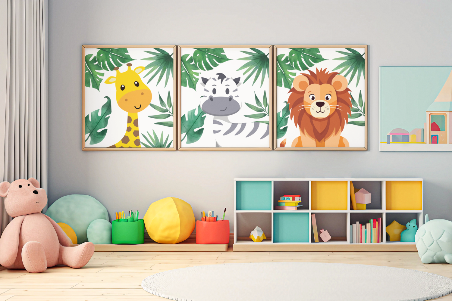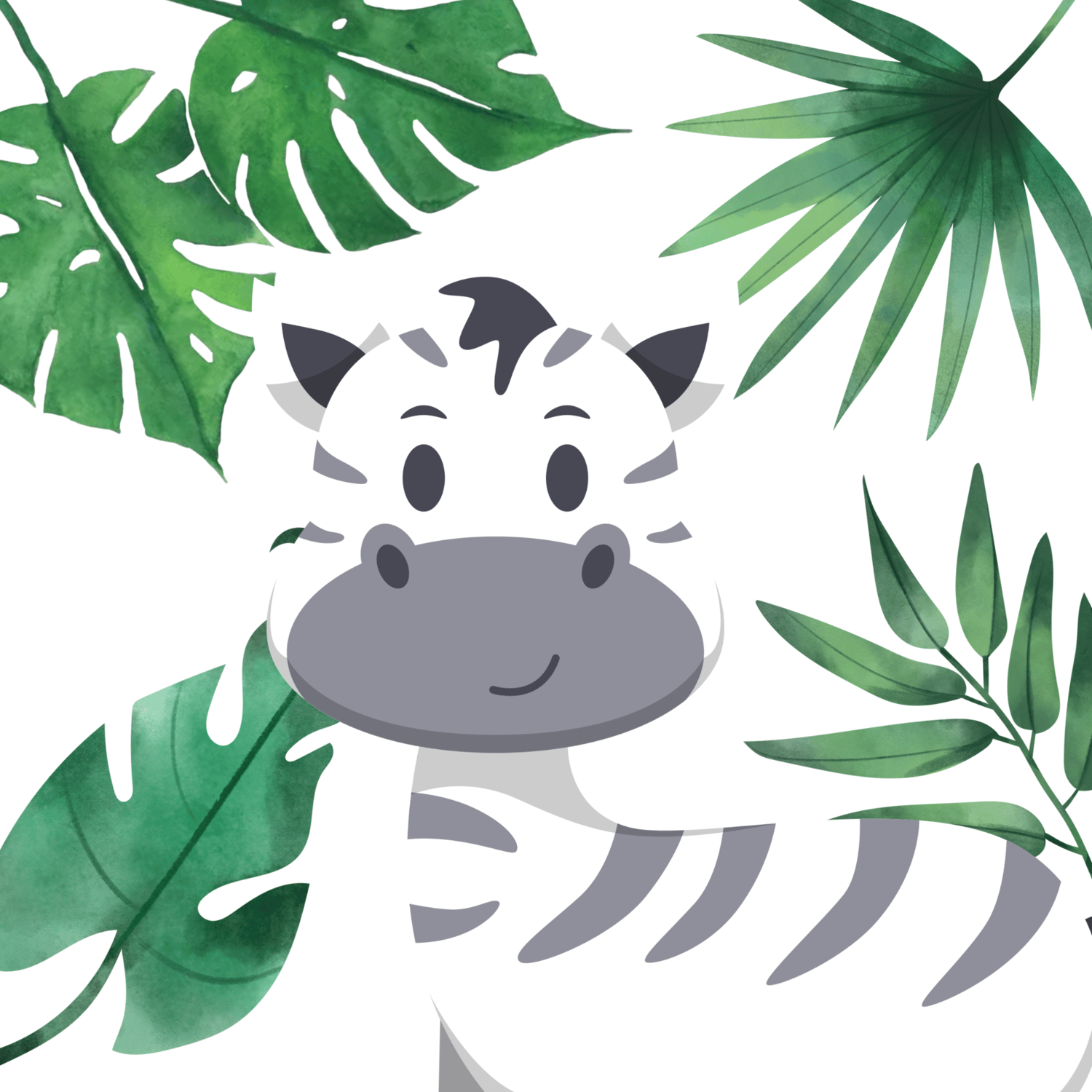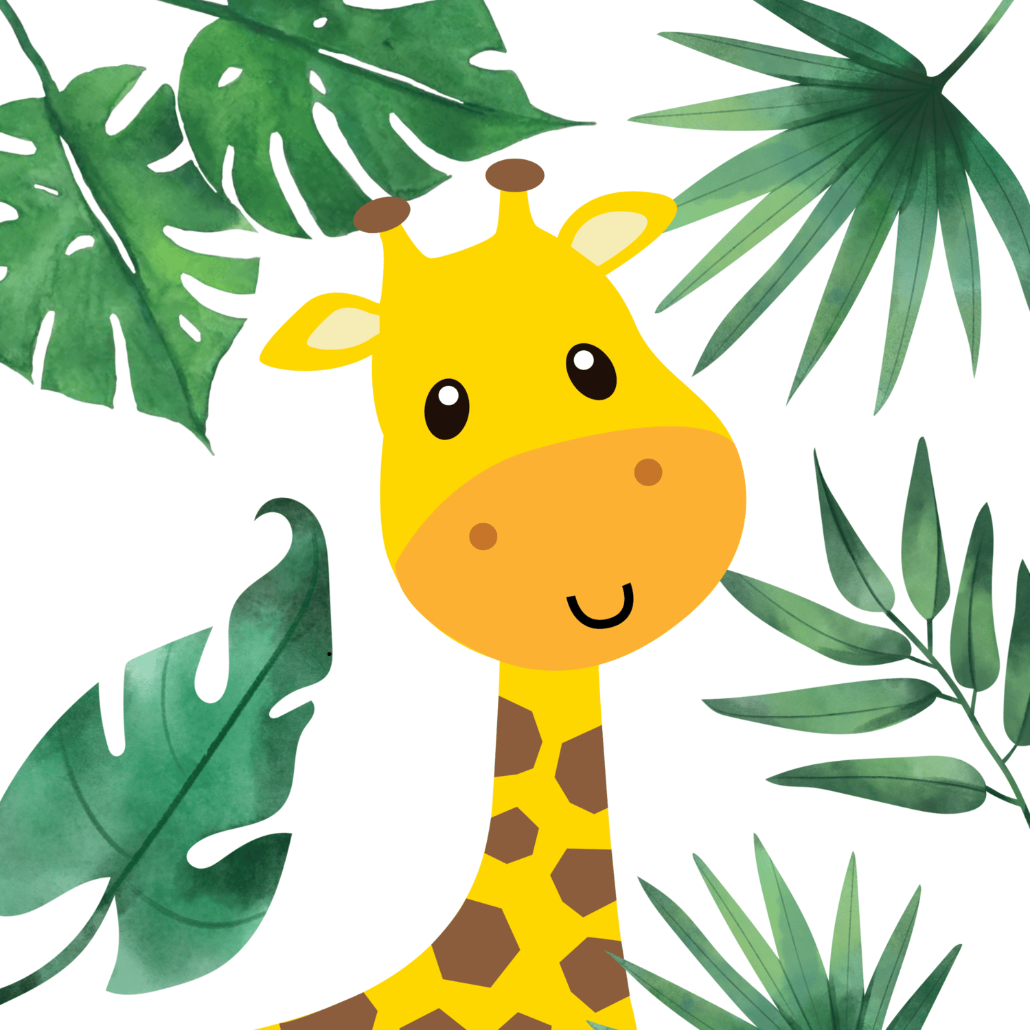 Adorable safari animals in leafy greens — a timeless jungle-themed print for kids or nursery decor..